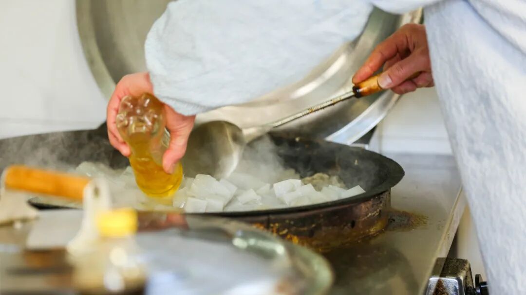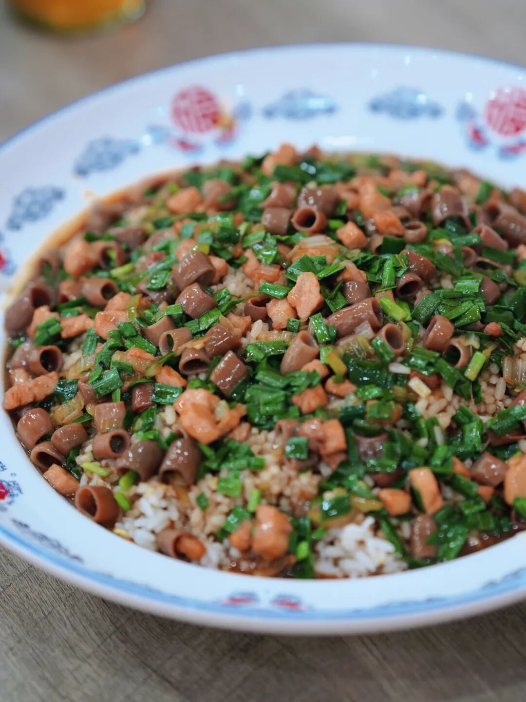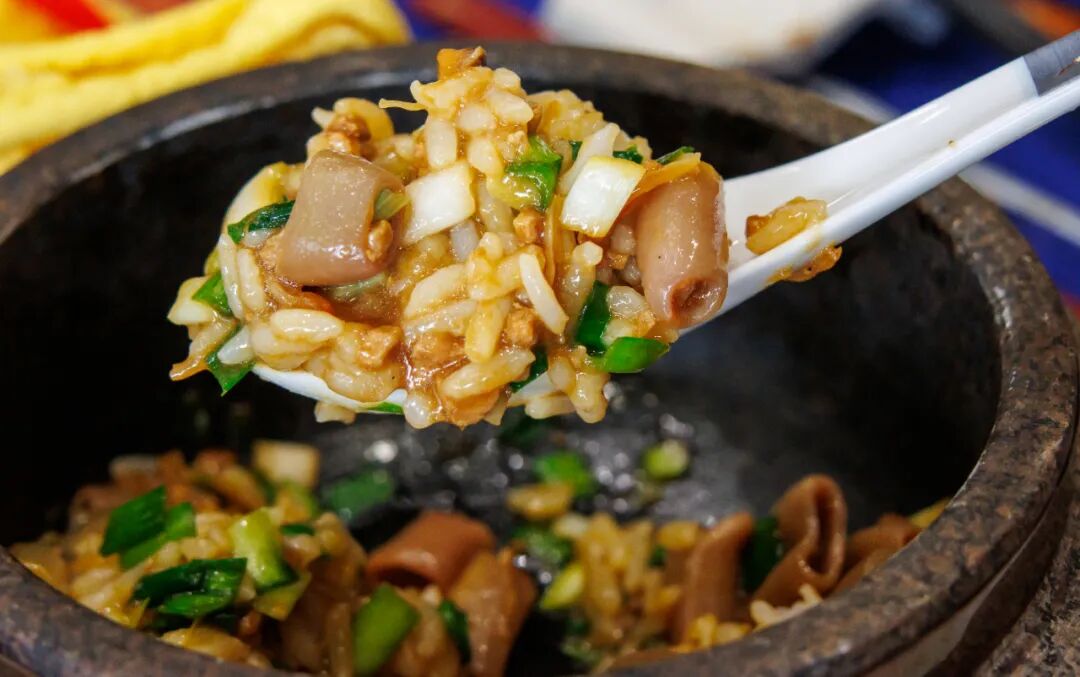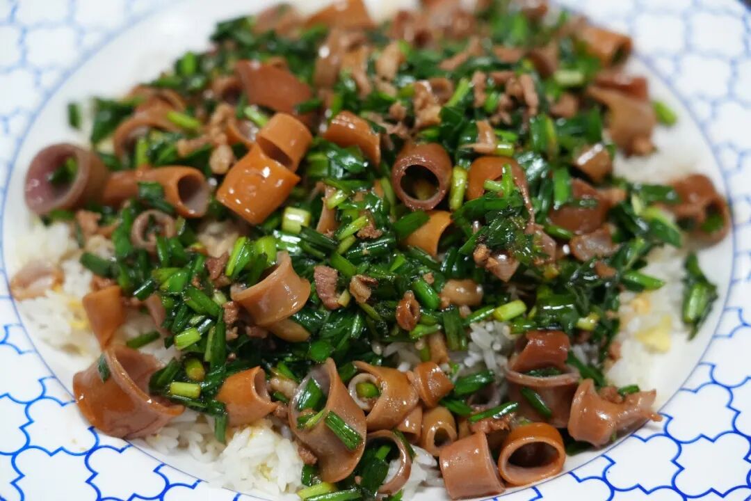 五花肉沫煸炒出香气,加入新鲜海肠和本地韭菜大火爆炒十几秒,保留极致的脆嫩口感,炒好的海肠裹着浓稠的酱汁,直接淋在热气腾腾的米饭上。入口的瞬间,海肠的脆弹、韭菜的辛香、米饭的软糯,在酱汁的调和下融为一体,层次感拉满。