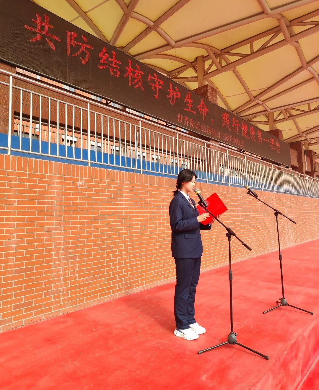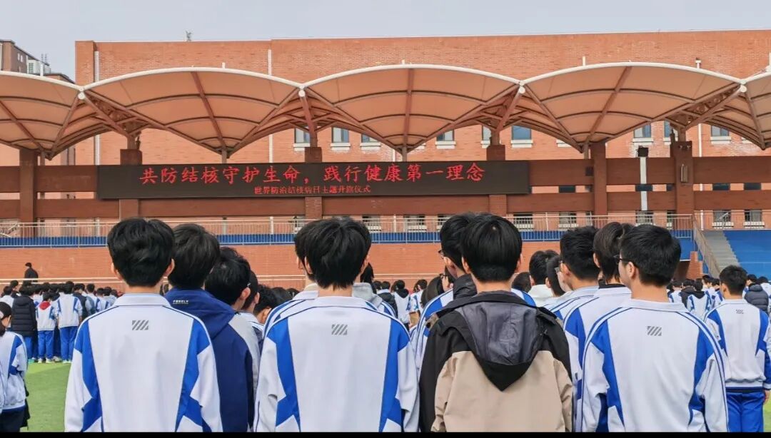 在第 31 个世界防治结核病日来临之际,为强化校园结核病防控工作,提升全体师生科学防治意识,济南大学城实验高中举行“共防结核守护生命,践行健康第一理念”主题升旗仪式。本次仪式由学生会生活部部长李佳航主持,2024 级 5 班董润杞、丁奕铭、王建博担任升旗手,全校师生共同参与。