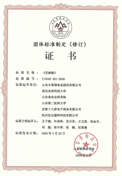 3月20日,由山东省粮油学会批准发布的《芝麻粉》团体标准(T/SCOS 001-2026)正式实施。该标准严格按照《中华人民共和国食品安全法》、国家标准化管理委员会《团体标准管理规定》及GB/T 1.1-2020《标准化工作导则 第1部分:标准化文件的结构和起草规则》等相关要求,由山东丰香园食品股份有限公司牵头,联合西北农林科技大学等6家单位共同起草,经山东省粮油学会团体标准专家委员会审查通过并发布实施。在标准起草与评审过程中,广泛听取了河南省农业科学院芝麻研究中心、中国农业科学院油料作物研究所、合肥工业大学、山东省标准化研究院、滨州芝麻产业协会等单位专家的意见建议。