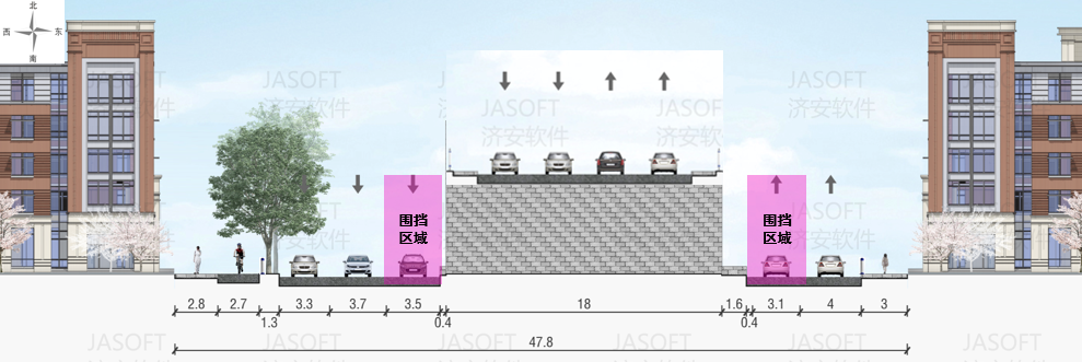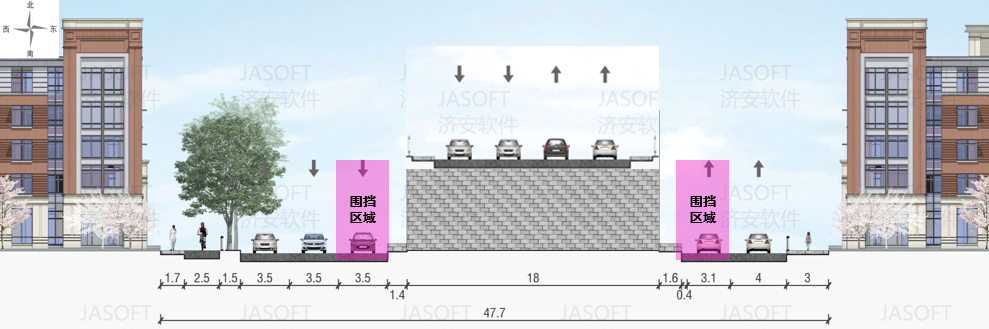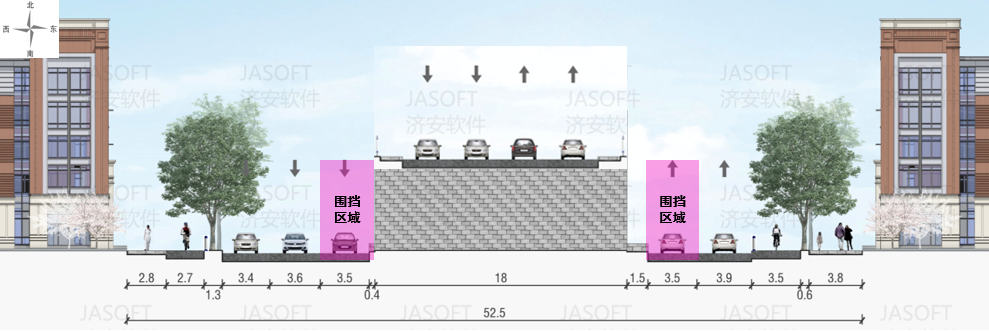 地面道路优化:桥下西半幅:机动车保留2车道通行,非机动车利用路缘石上道路通行,设置机非隔离护栏;桥下东半幅:机动车保留1车道通行,非机动车利用路缘石上道路/人行道通行,设置机非隔离护栏;全施工段保障行人通行空间,与非机动车道合理分隔,确保慢行交通安全。