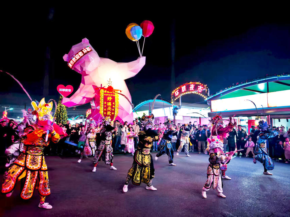 3月20日,农历二月二“龙抬头”,一场酣畅淋漓的英歌舞在济南环联夜市上演。舞者们面绘梁山好汉脸谱,手持双短棒,在锣鼓、唢呐的伴奏下,以整齐划一的节奏踏出“双龙出海”“猛虎下山”等经典阵形。当天环联夜市客流量达到9万人次。
