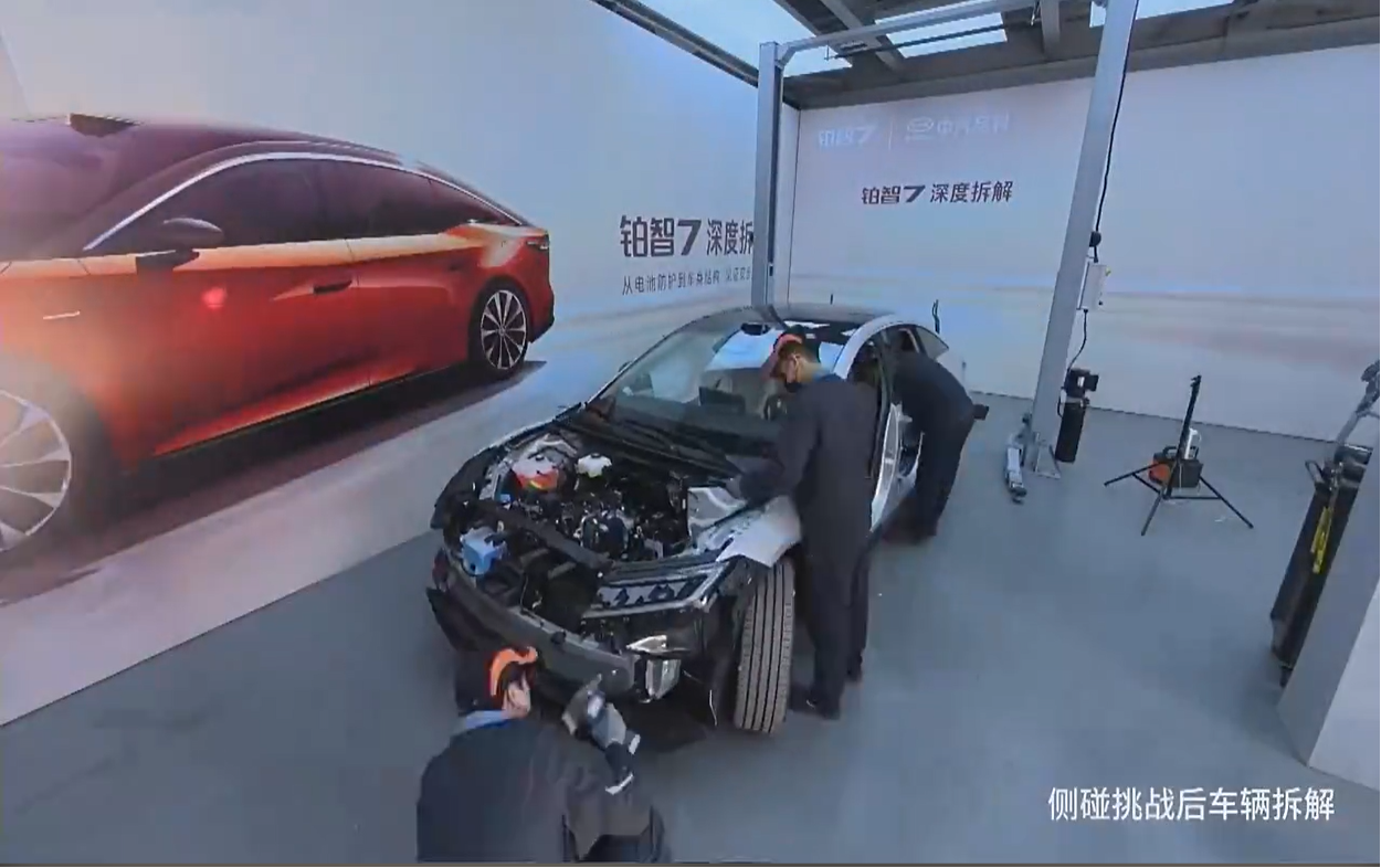 此外,铂智7还完成了多项严苛测试。以“异形刮底叠加侧碰”测试为例,车辆先经19cm高异形硬物刮底,再遭60km/h侧面撞击。乘员舱结构保持完整,电池包未起火、未泄漏,高压下电与E-CALL紧急呼叫同步触发,从结构防护到救援响应形成闭环。