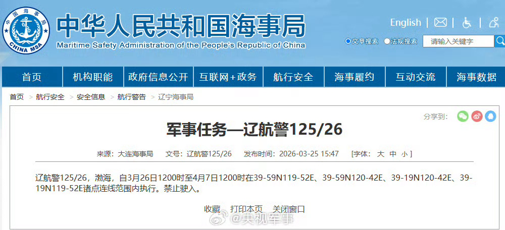航行警告!渤海部分海域执行军事任务快讯 | 2026-03-26 10:26:31 微信扫码扫码下载客户端据中国海事局网站消息,大连海事局发布航行警告,3月26日12时至4月7日12时,渤海部分海域执行军事任务,禁止驶入。 责任编辑:姜凯宁