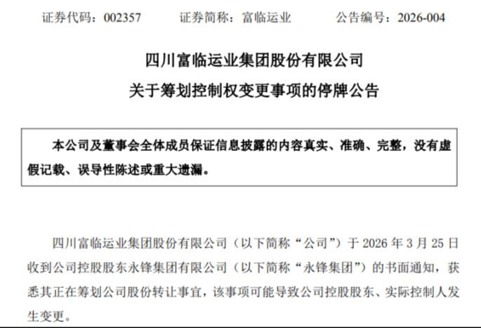 3月25日晚间,四川上市公司富临运业(002357.SZ)公告称,公司当日获悉永锋集团有限公司(下称“永锋集团”)正在筹划公司股份转让事宜,该事项可能导致上市公司控股股东及实际控制人发生变更。为保证公平信息披露、避免造成公司股价异常波动,公司股票自3月26日开市起停牌,预计停牌时间不超过2个交易日,待相关事项确定后及时披露公告并申请股票复牌。