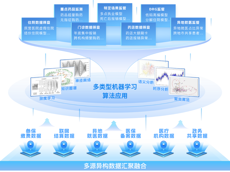 围绕住院、门诊、药店、异地就医、重点药品、DRG支付、特定场景等七大监管领域,基于逻辑回归、随机森林、支持向量机、神经网络等算法,累计构建31个具有针对性的主题识别模型,通过算法组合与场景化适配,实现多层次、高精度的风险筛查。