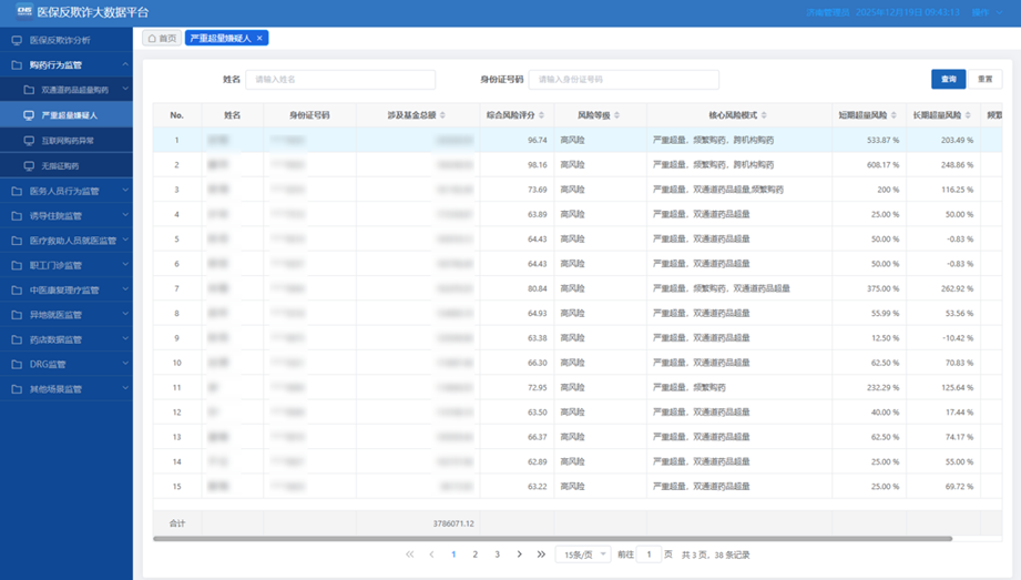 针对隐蔽化、复杂化的欺诈骗保行为,围绕“执业、就医、诊疗”等关键环节,构建包括“住院异常”“项目异常”“购药异常”“违规执业”等7类31个大数据反欺诈模型,精准发现并查处了“虚构检查”“虚假住院”等违规案例,实现对欺诈骗保行为的精准识别与高效打击。