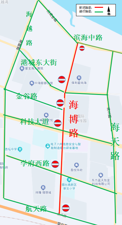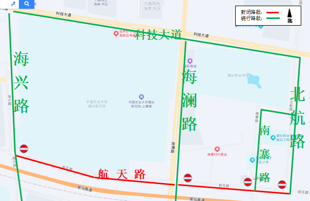 科技大道(东段北航路—海河西路段、西段区界—海越路段)3月25日—8月31日进行半幅交替封闭施工。