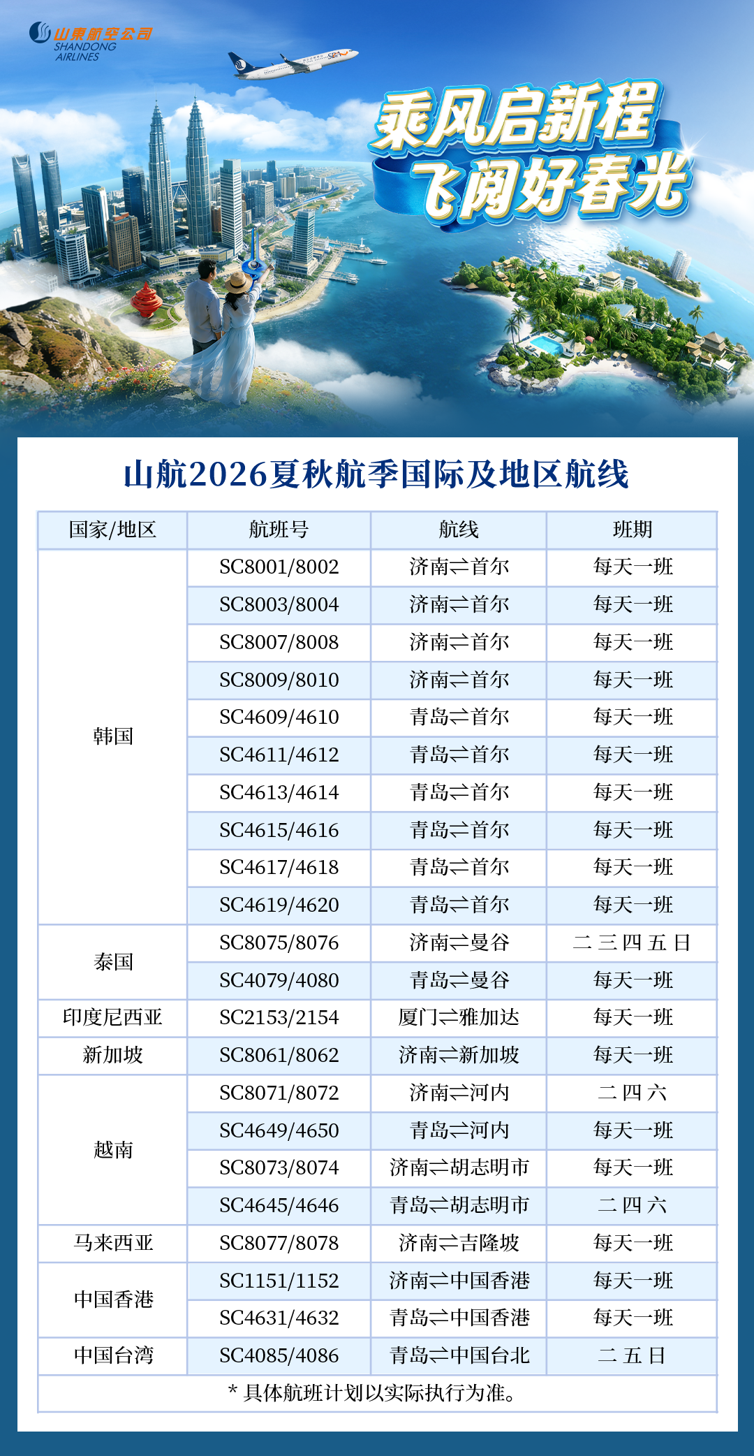 2026年夏秋航季,山航将持续优化航线网络、提升服务品质,助力旅客畅行全国、联通世界。查询航班信息或预订机票,欢迎登录山航官网(www.sda.cn)、下载山东航空APP或使用山航官方小程序,如需咨询可拨打山航24小时客服热线95369。(姜寿涵 王亚)