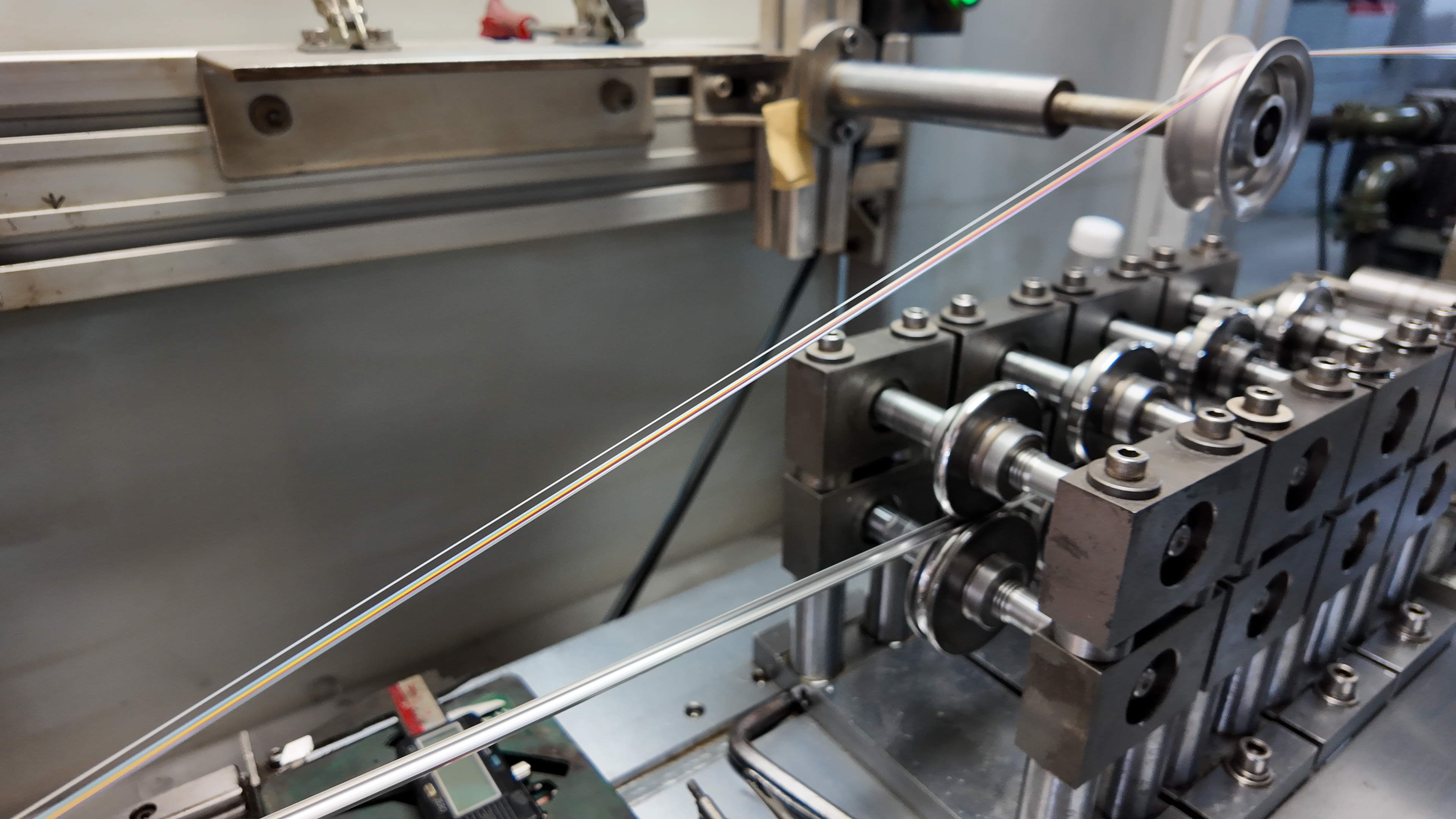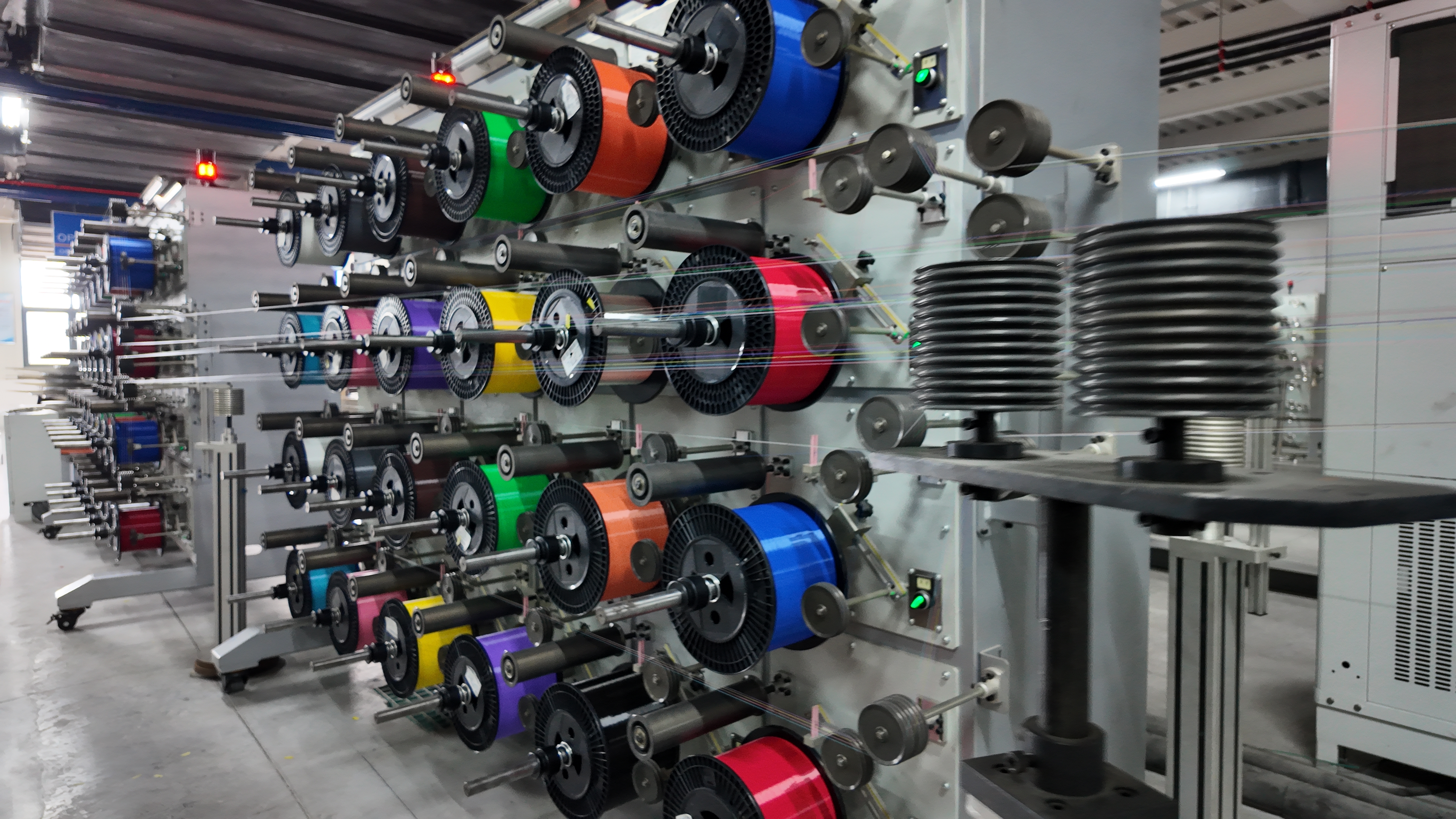 而在企业现有的生产车间内,着色工序生产线正高效运转、一派繁忙景象:透明的光纤原材料经过精密设备的精准加工,依次被着色区分成蓝、橙、绿、棕、灰、白、红、本(黑)、黄、紫、粉、青12种标准色谱的光缆纤芯,色彩清晰、标识规范,为后续光纤识别、线路运维提供便利;着色完成后的纤芯随即流转至下一环节,有序进入光单元制作工序,层层加工、环环相扣,构成了光缆生产的核心工艺流程。