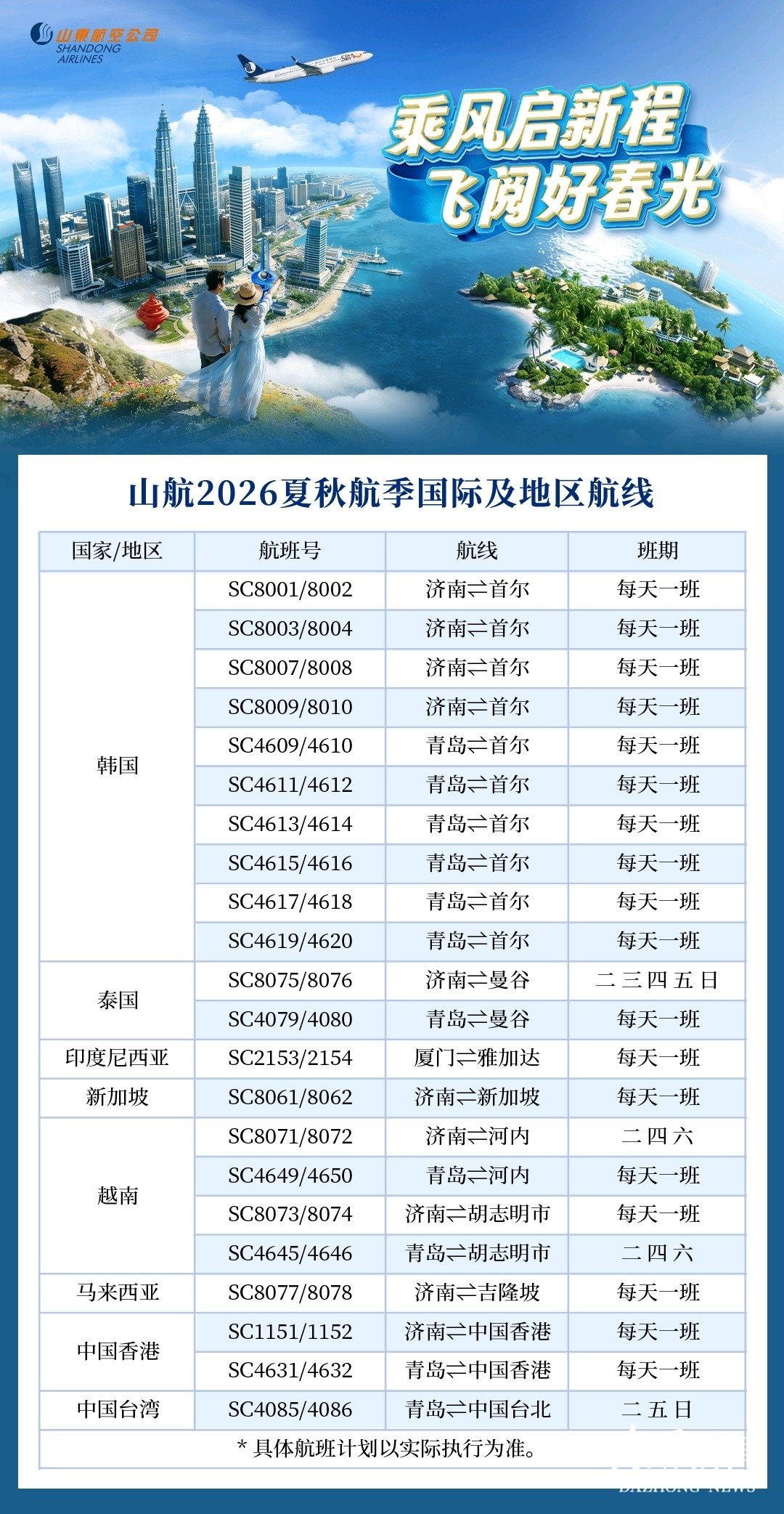 3月29日起,全国民航正式进入2026年夏秋航季。山航将新增、加密多条国内、国际航线,同步升级“山航快线”,为旅客提供便捷、高效的出行体验。