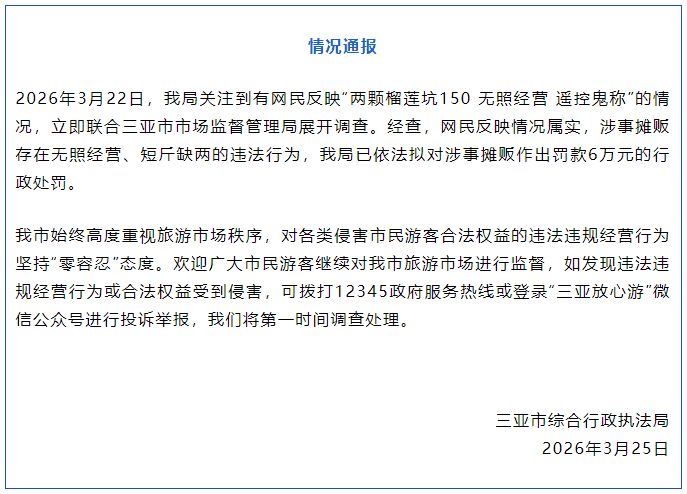 3月25日,三亚市综合行政执法局发布情况通报,2026年3月22日,三亚市综合行政执法局关注到有网民反映“两颗榴莲坑150 无照经营 遥控鬼秤”的情况,立即联合三亚市市场监督管理局展开调查。经查,网民反映情况属实,涉事摊贩存在无照经营、短斤缺两的违法行为,我局已依法拟对涉事摊贩作出罚款6万元的行政处罚。