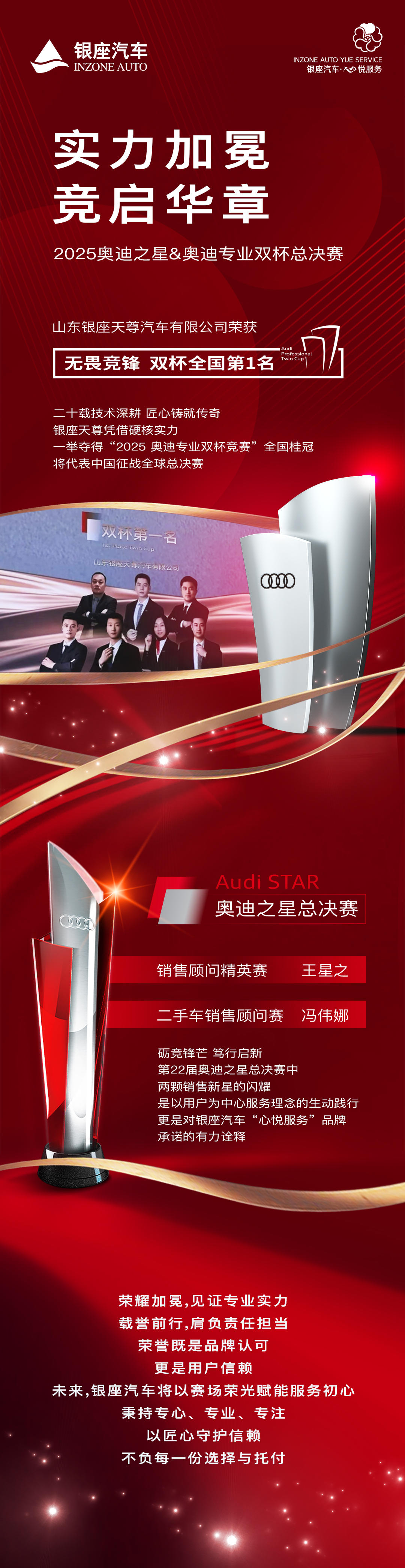 在同步举行的第22届奥迪之星总决赛中,销售顾问王星之、二手车销售顾问冯伟娜凭借对产品的深度理解、对客户需求的精准把握,双双荣获“奥迪之星”精英称号。双星同台闪耀,不仅是个人能力的充分彰显,更是银座汽车以用户为中心服务理念的生动践行,也印证了银座汽车“心悦服务”品牌对用户的郑重承诺。