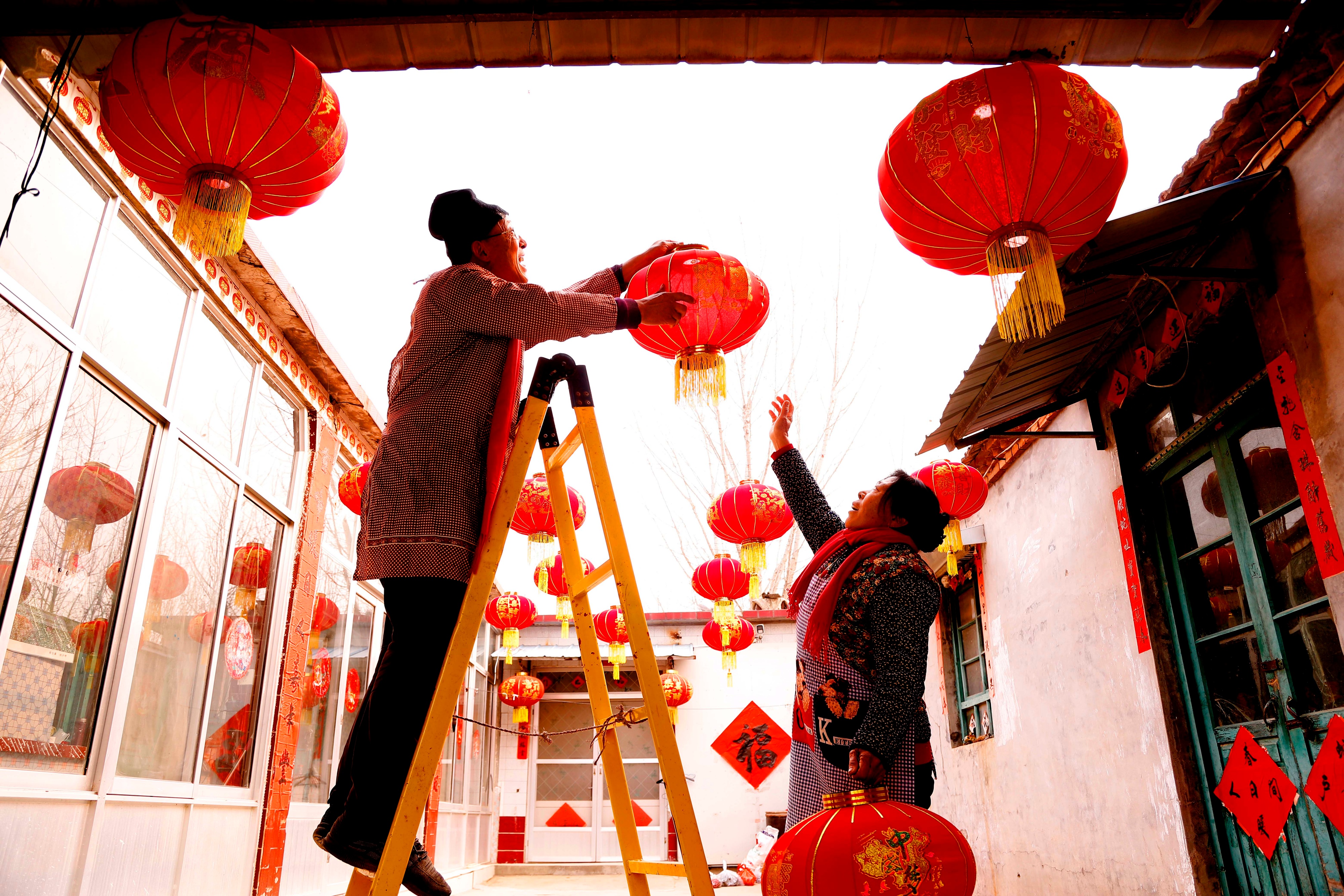 作品说明:2025年春节期间,山东省济南市济阳区垛石街道于良民村,为了营造喜庆气氛,村民王玉花和老伴挂起了红灯笼。