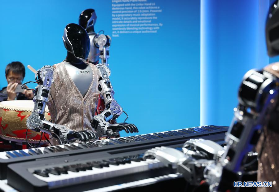 24일 중관춘포럼 연례회의 프레스센터에서 음악을 연주하는 휴머노이드 로봇. (사진/신화통신)