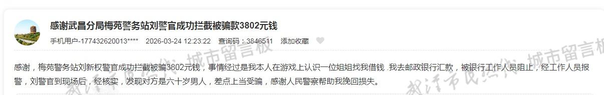 游戏上认识的“姐姐”向其借钱,男子小刘(化名)前往银行汇款被工作人员阻止;经核实,借钱的“姐姐”实为六旬男子。日前,小刘向武汉城市留言板反映自己险些被骗3800余元一事,向助其及时止损的银行工作人员和武汉民警致谢。