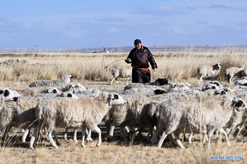 17일 시린궈러맹 가다부치(嘎達布其)진에서 양을 모는 유목민. 2026.3.18