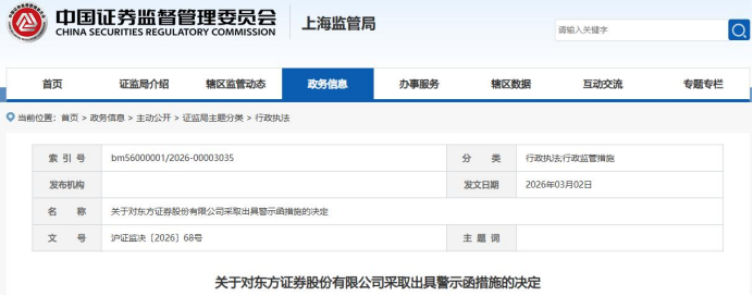 3月20日,证监会上海监管局公布的行政监管措施显示,国泰海通证券、中德证券、东方证券、联储证券等4家券商被同时采取出具警示函措施的行政监管措施。