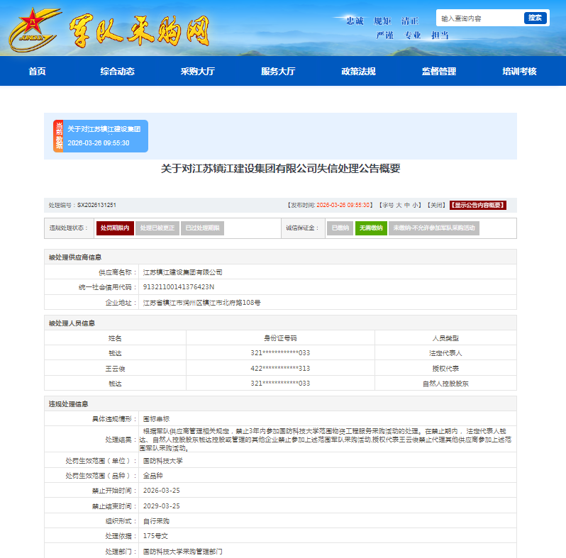 齐鲁晚报·齐鲁壹点记者于军队采购网了解到,3月25日,江苏镇江建设集团有限公司(下称“江苏镇江建设集团”)上榜军队采购失信名单,处理部门为国防科技大学采购管理部门。