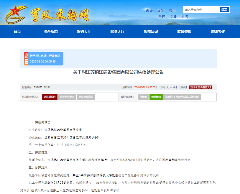 涉“围标串标”,江苏镇江建设集团上榜军队采购失信名单