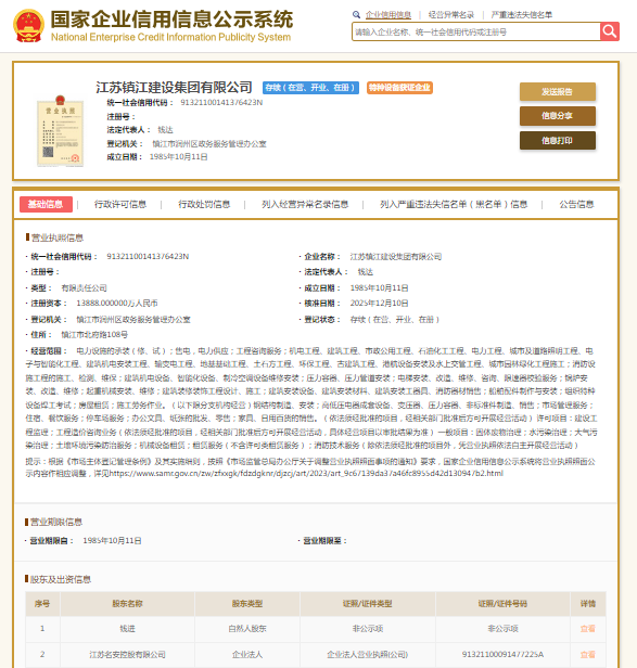 国家企业信用信息公示系统显示,江苏镇江建设集团有限公司成立于1985年,注册资本13888万元,法定代表人钱达,大股东为江苏名安控股有限公司。