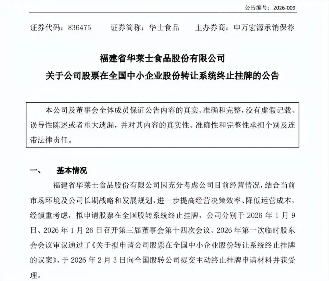 2026年2月11日,福建省华士食品股份有限公司(以下简称华士食品)发布《关于公司股票在全国中小企业股份转让系统终止挂牌的公告》,宣告公司正式完成新三板摘牌,股票自2026年2月12日起终止在全国中小企业股份转让系统挂牌,结束其近十年的上市历程。