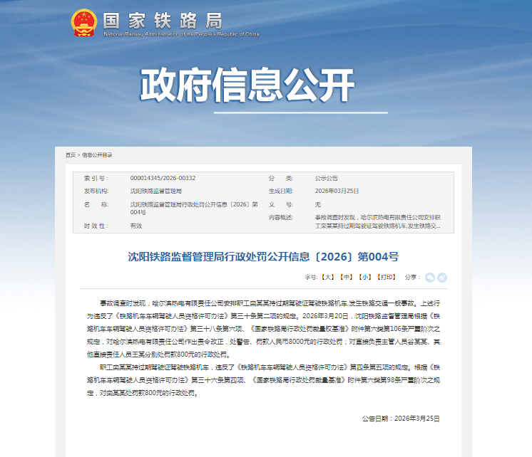 齐鲁晚报·齐鲁壹点记者于国家铁路局政府信息公开栏了解到,3月25日,其公示了沈阳铁路监督管理局行政处罚公开信息〔2026〕第004号。据悉,被行政处罚的企业为哈尔滨热电有限责任公司(下称“哈尔滨热电”)。