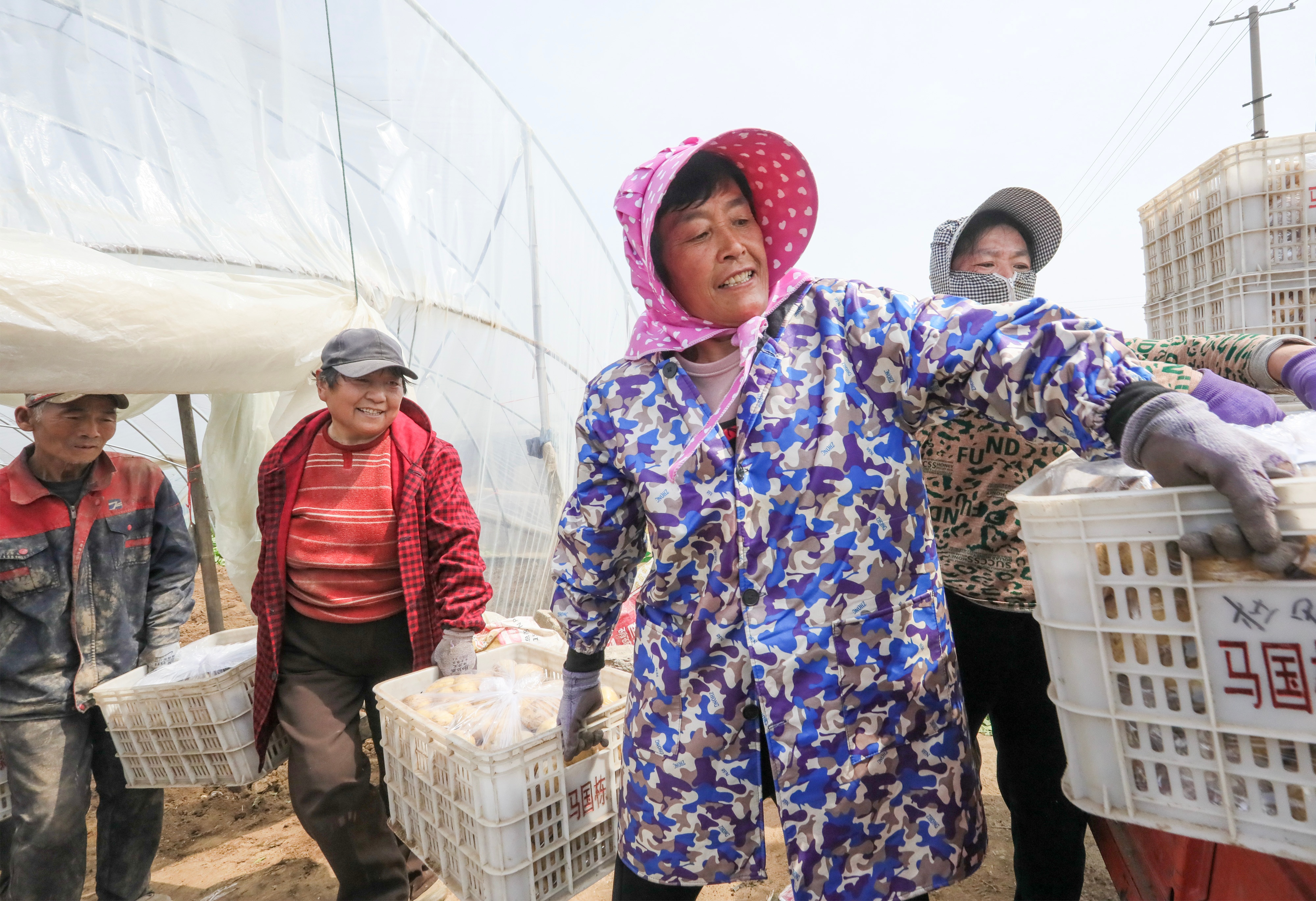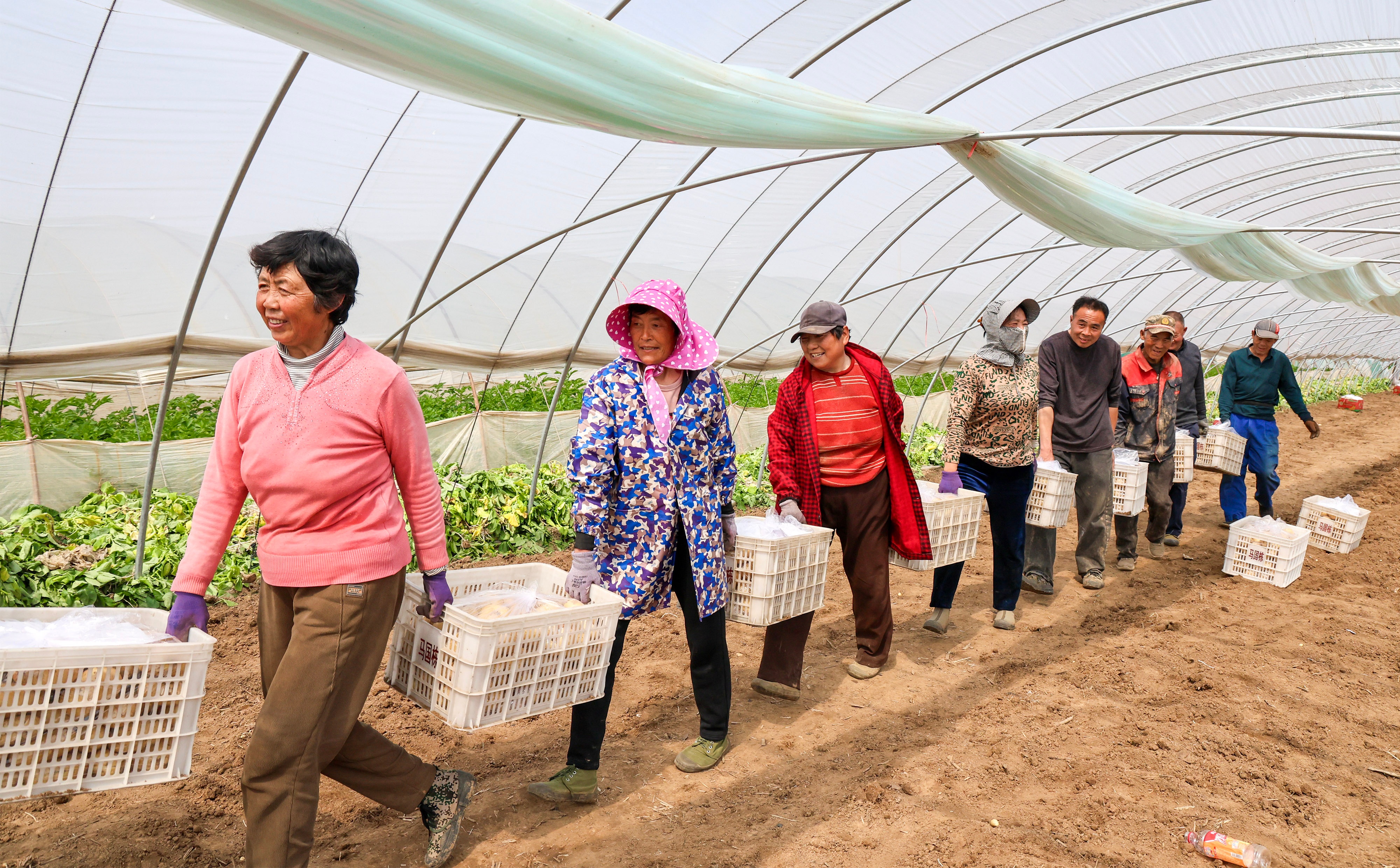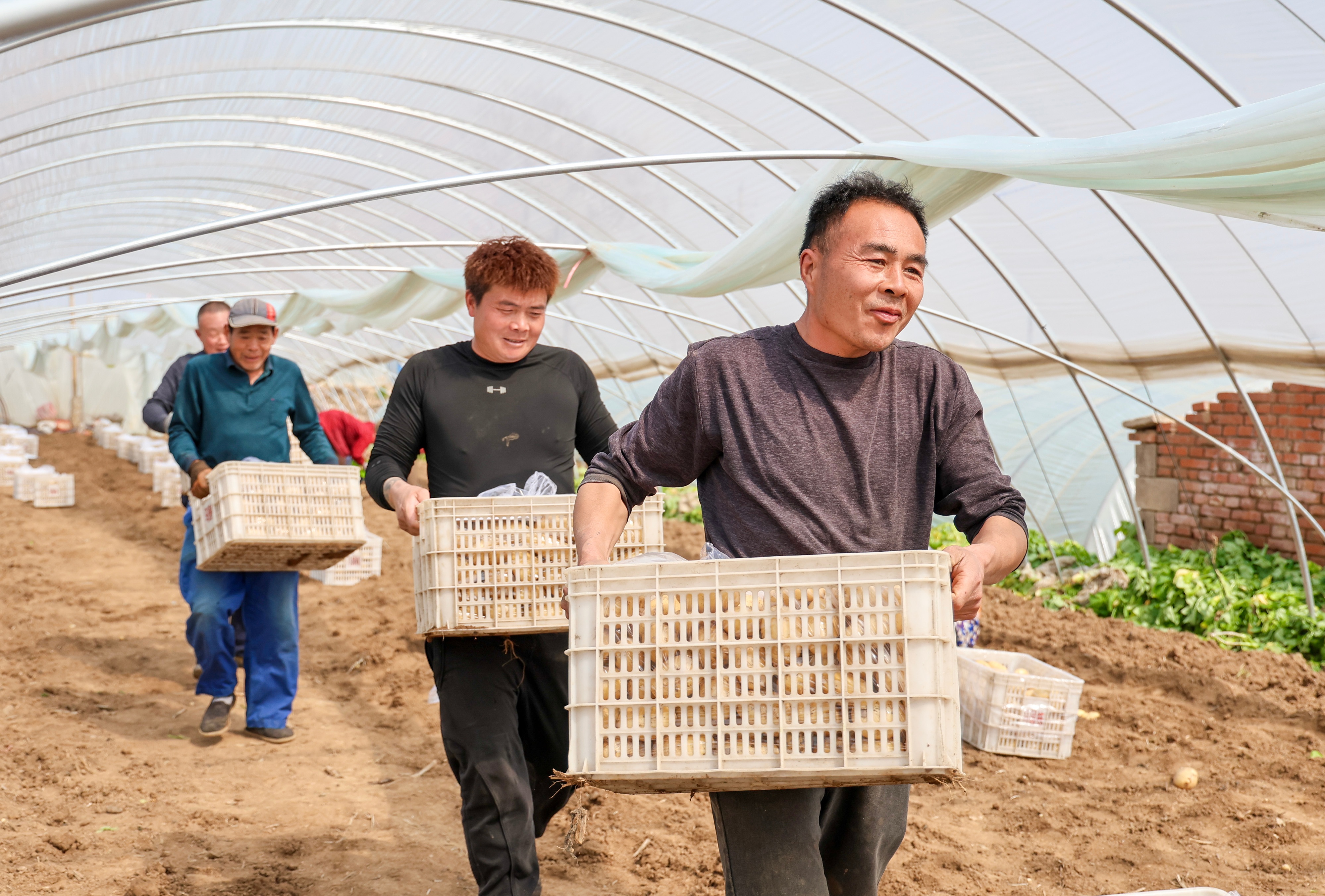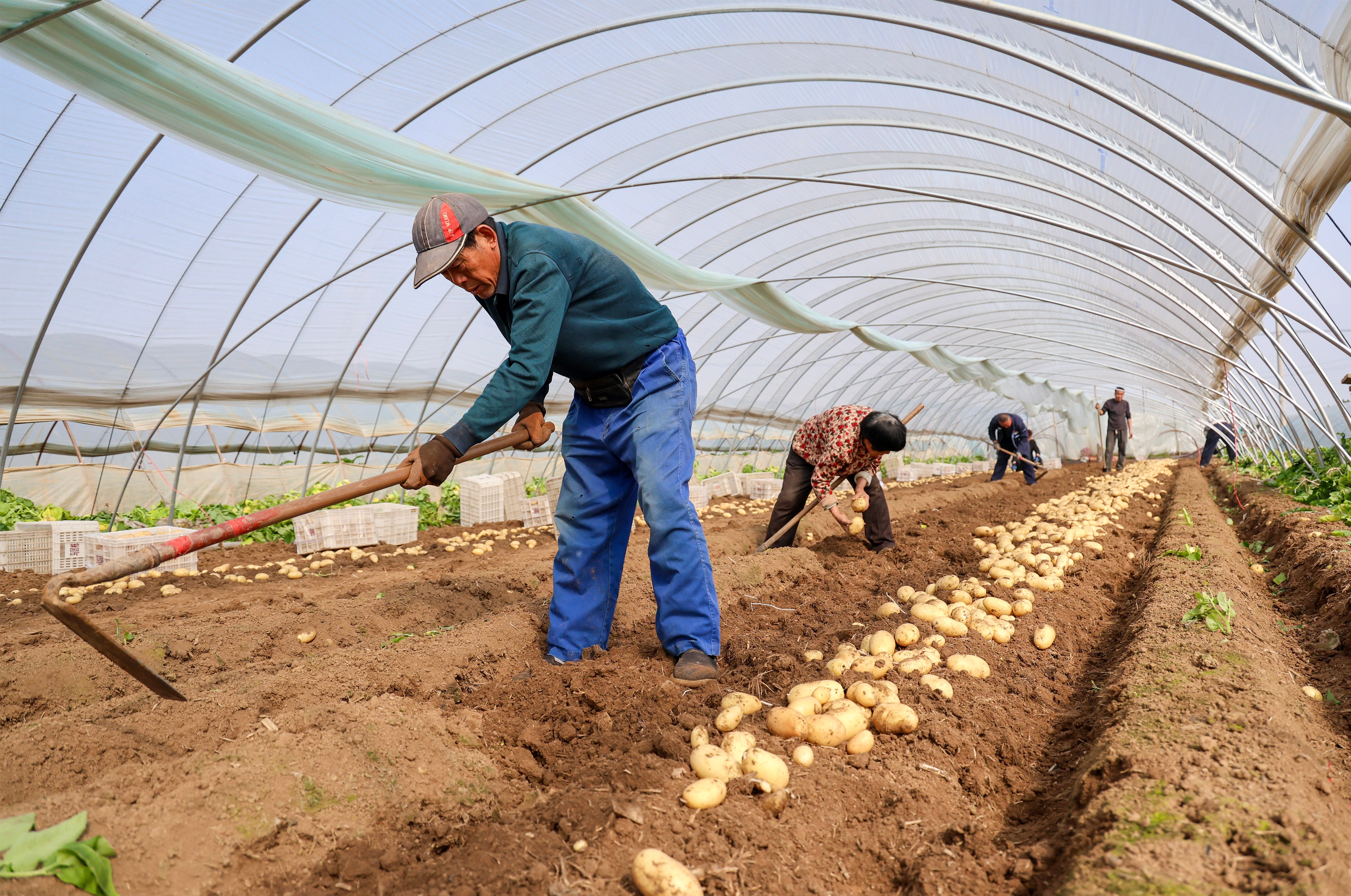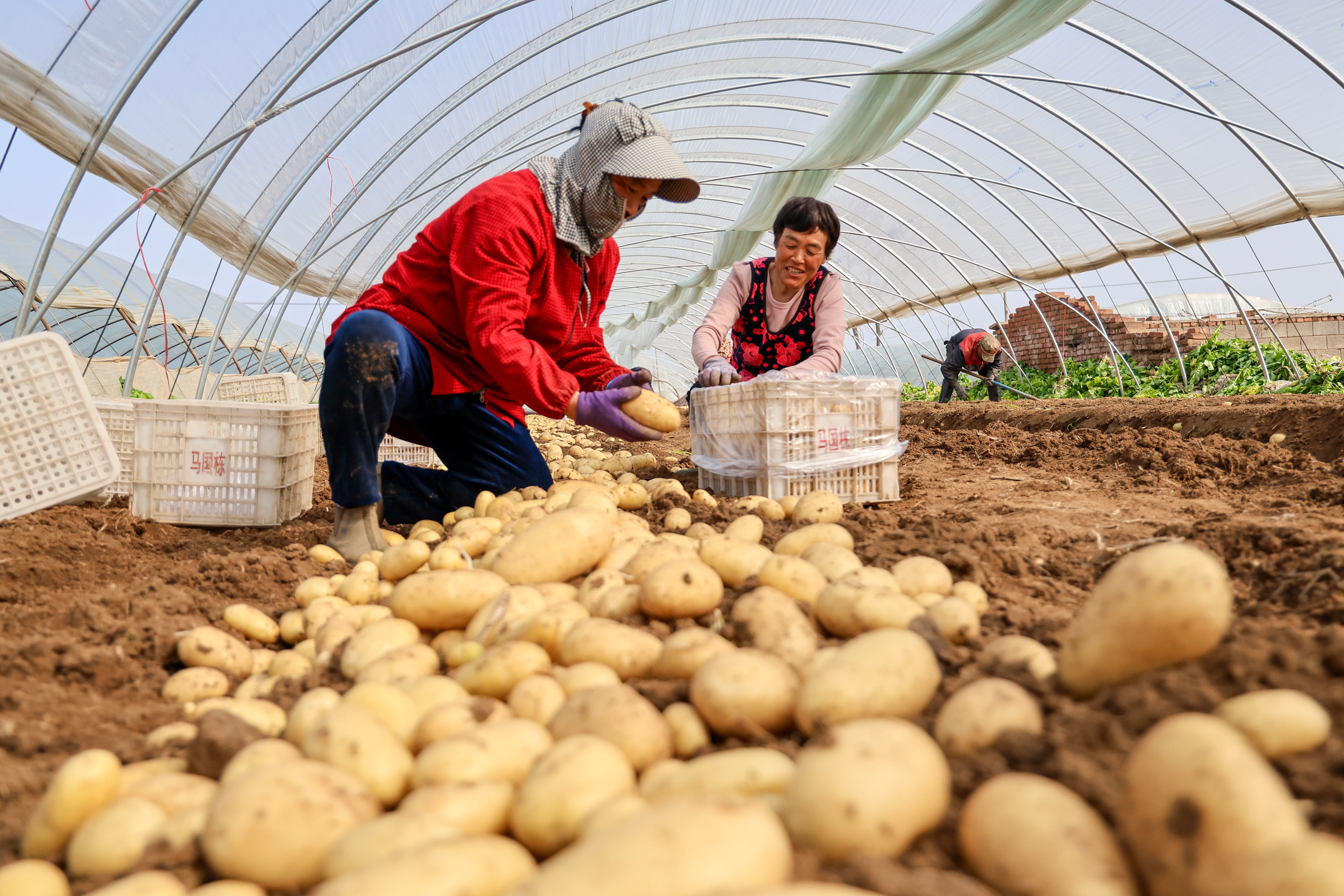 3月26日,滕州46万亩春季马铃薯开始收获。近年来,滕州市积极调整马铃薯种植结构,提早栽培马铃薯,抓好减肥减药节水技术,当地拱棚种植的“3膜4膜”马铃薯比原来的大田“1膜2膜”种植提早30天左右进入市场,增加了薯农的收入。图为滕州市马楼村民正在收获春季马铃薯。(大众新闻记者孟令洋通讯员宋海存)