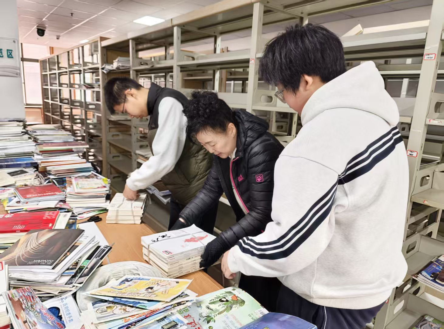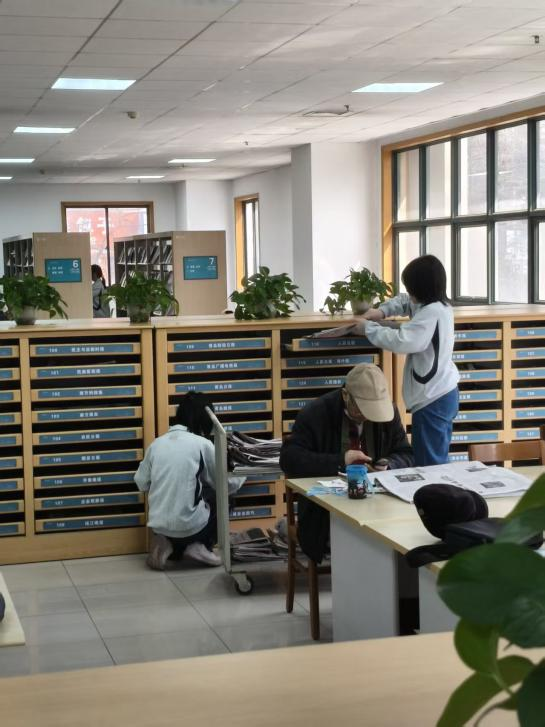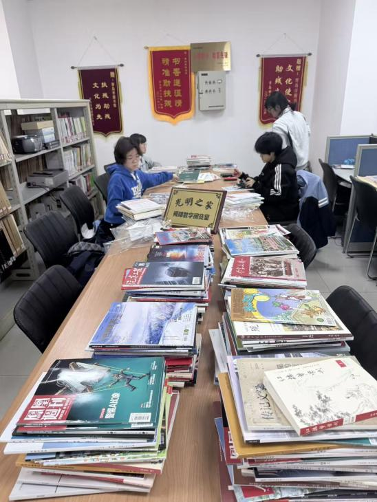 随后大家分工协作,高效完成图书归位、新书贴磁条盖章、过期期刊装订归档等任务,工作流畅有序,彼此之间配合默契,展现出良好的团队意识与奉献精神。