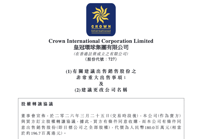 3月25日晚间,皇冠环球集团(00727.HK)发布公告称,于2026年3月25日(交易时段后),本公司(作为卖方)与买方Easy Gain Limited订立股权转让协议,公司同意出售目标公司Grandlife Investment Co. Limited的全部股权,代价为人民币1.8亿元(相当于约1.967亿港元)。