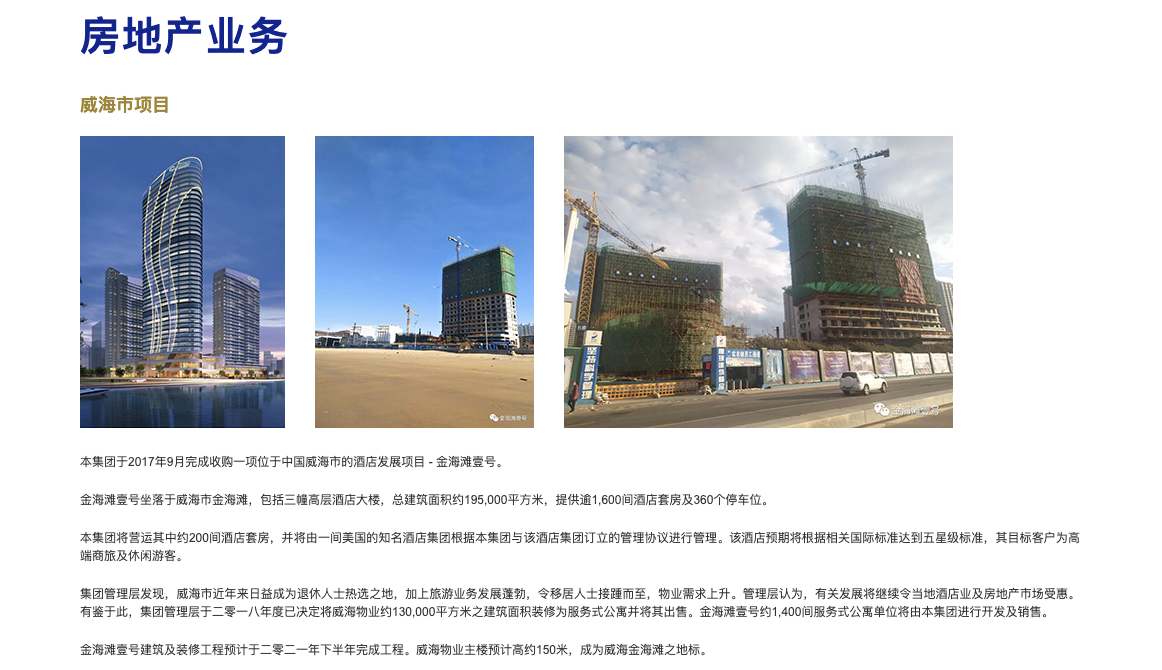 受新冠肺炎疫情影响,威海物业工程建设出现大幅延误,目前仍处于建设阶段。具体来看,两座低层大楼的建设工程已竣工,而高层大楼仍有12层待建,完成后方可实现整体竣工,相关建筑及装修工程目前预计将推迟至2026/2027财年完成。威海物业的开发初步成本(不含皇冠环球集团收购威海润禾时支付的土地成本)预计将超过人民币10亿元。