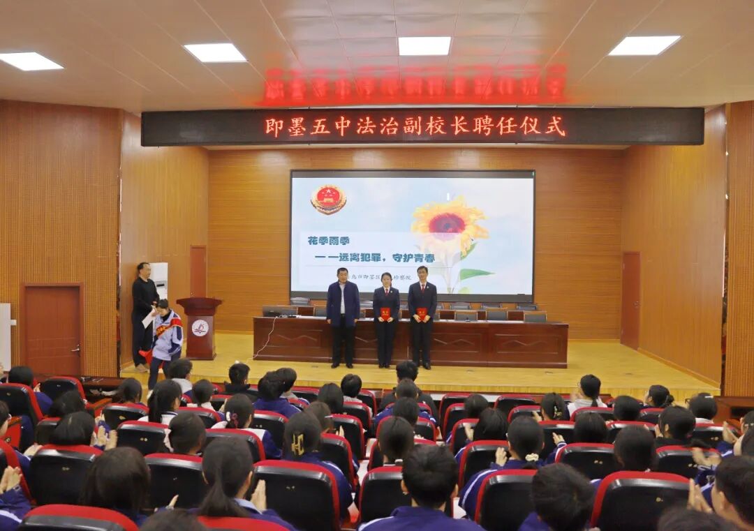 宣讲结束后,现场举行聘任仪式,即墨区第五中学正式聘任即墨区检察院第五检察部主任赵兰君担任法治副校长,第二检察部检察官马璐瑶为法治辅导员,并为二人颁发聘任证书。新任法治副校长赵兰君在发言中寄语同学们:“要常怀敬畏之心、严守法律底线,做到‘己所不欲,勿施于人’,愿同学们在青春路上遵纪守法、向阳而行,健康快乐成长。”