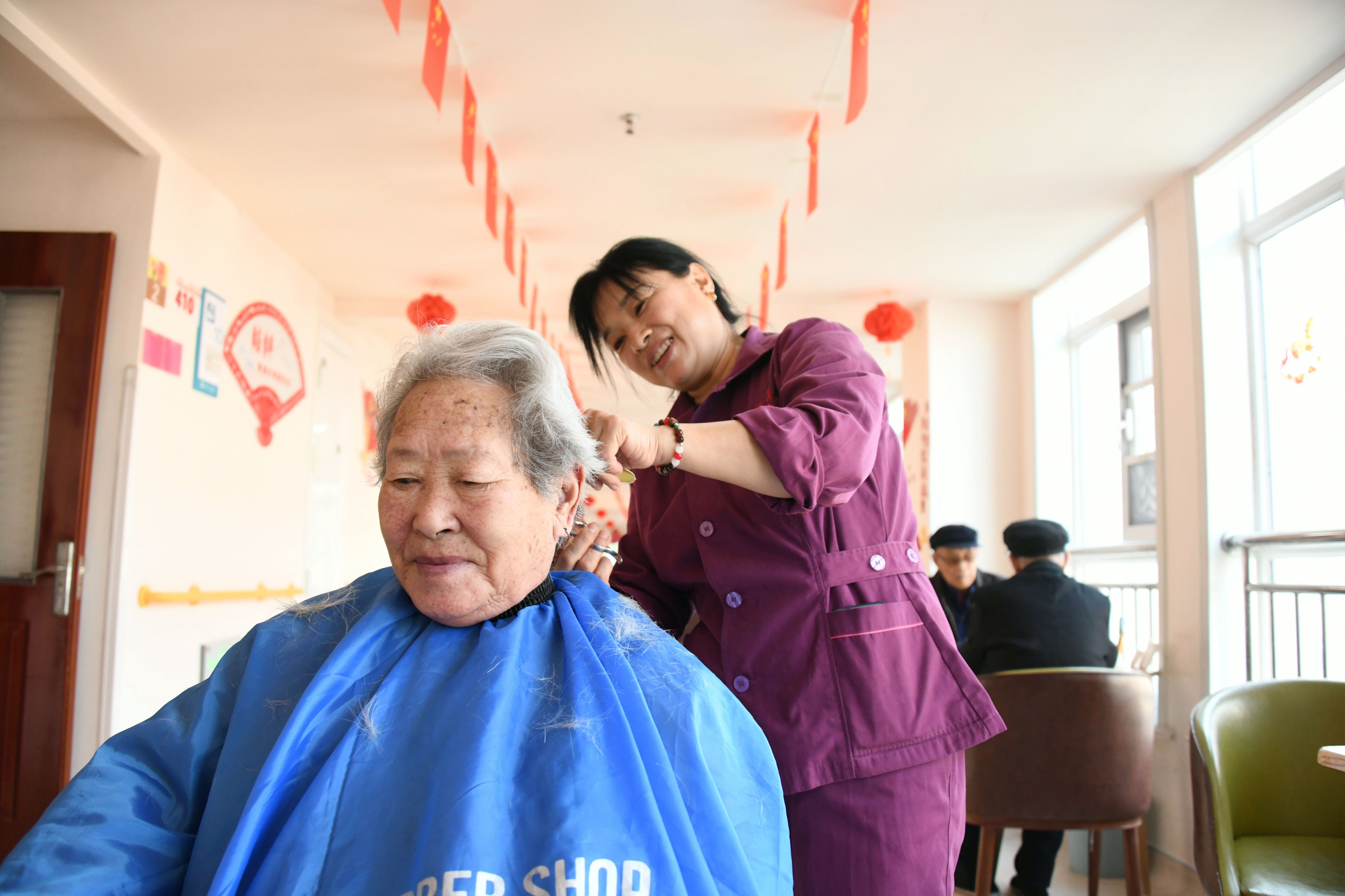 3月25日,在沂南县天河养老服务中心,护理人员在给老人理发。