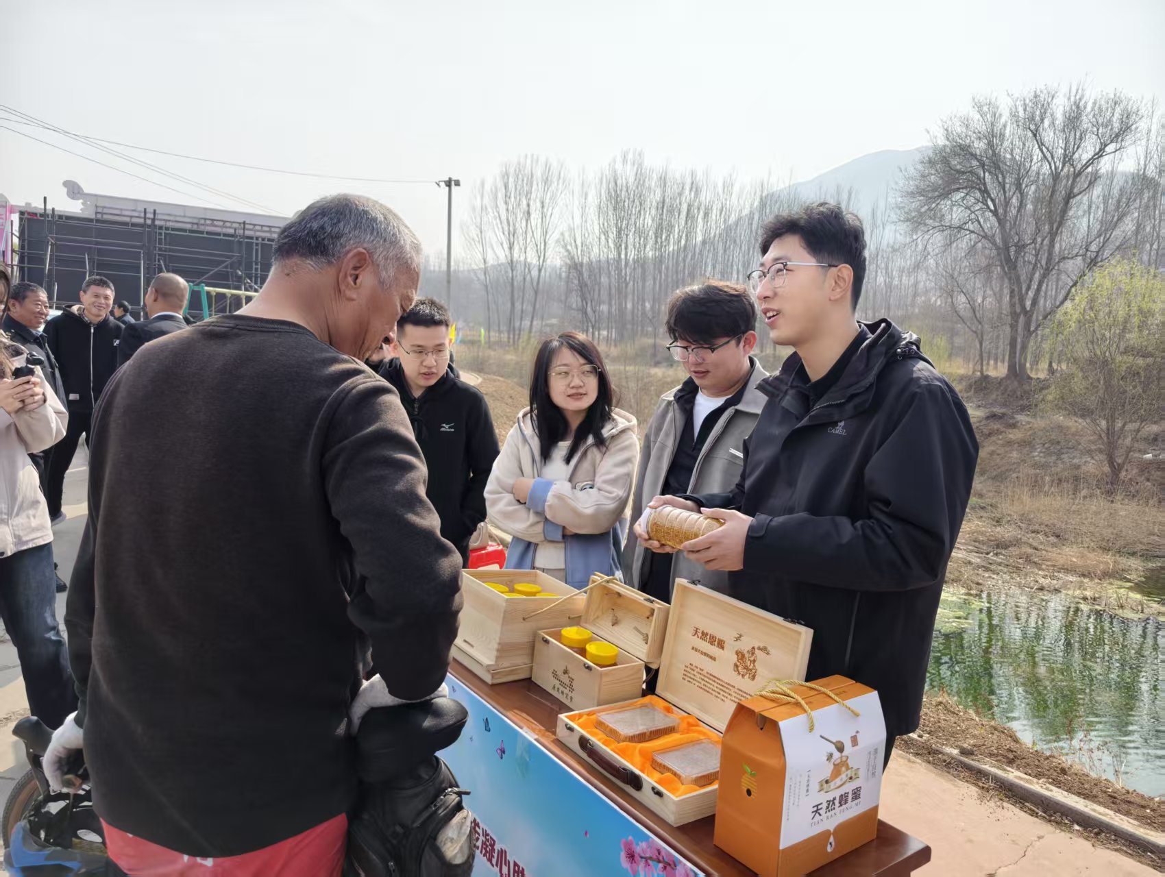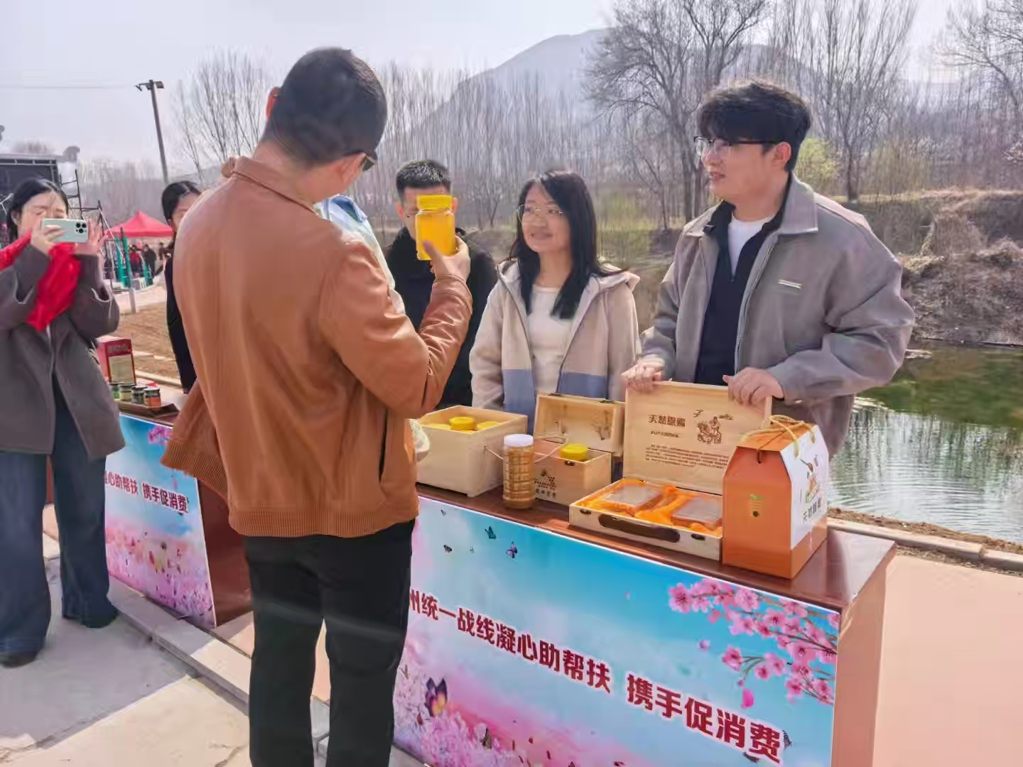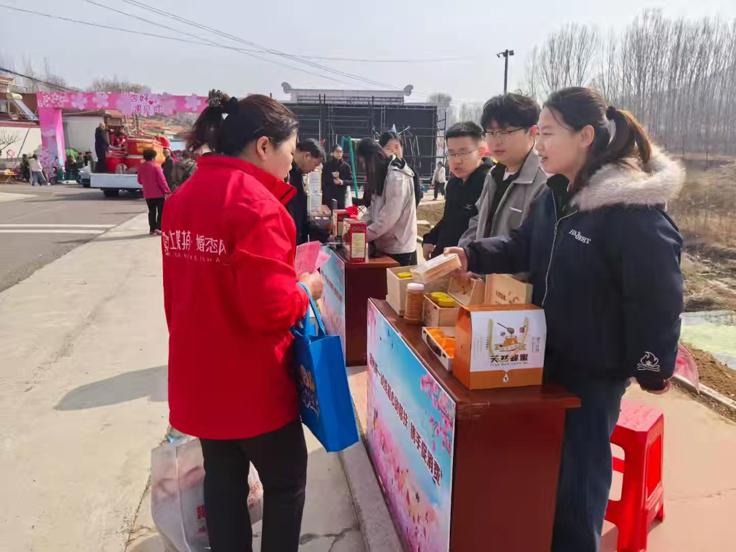 春和景明,杏韵满枝。3月20日,邹平市杏花节如期启幕,魏桥镇丁家庄村顺势而为,在村“两委”与驻村选调生何晋昊助力下,将本村特色农产品摆上展销现场,上宝蜂蜜等农品一经亮相便备受游客青睐。这场文旅与农品的双向赋能,不仅让乡村好物借文旅热度变现为增收成果,更彰显村庄依托文旅联动拓宽致富路径的实干担当。