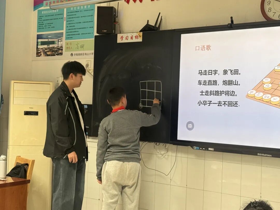 另一组志愿者以“传统象棋文化”为主题,为同学们带来一堂生动的文化启蒙课。志愿者从象棋起源传说、“楚河汉界”的历史典故入手,用通俗易懂的语言,带领同学们走进象棋的文化世界,讲解棋子走法与规则,现场示范对弈技巧,并组织小型对弈体验,让同学们在趣味互动中感受中华传统文化的博大精深,增强文化认同感与自豪感。