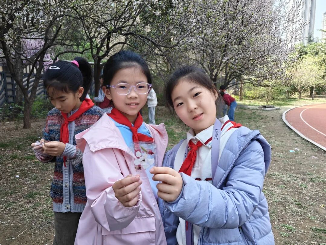 现场观察中,孩子们惊奇地发现,杏花的花苞呈纯红色,形似一颗颗小巧的玛瑙;完全绽放后,花瓣逐渐变为白色,尖端仍点缀着一抹淡粉,宛如少女羞涩的脸颊;待花朵凋落时,便变为纯净的白色,每一棵杏树都呈现出“红红白白一树春”的绚烂景致。老师向孩子们讲解,杏树是典型的先花后叶植物,总是赶在叶片长出前绽放繁花,成为春日里最早的亮色,帮孩子们厘清了杏花生长的基本特点。