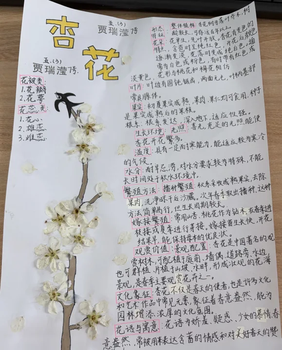 相较于低年级的直观观察,高年级学生的探究更为深入,他们将观察视角从单朵杏花延伸至整棵杏树,乃至整个生态系统。在春日暖阳下,学生们系统学习杏树的生长周期,从种子萌发、幼苗生长,到开花、授粉、结果,再到落叶休眠,完整追溯杏树的一生。