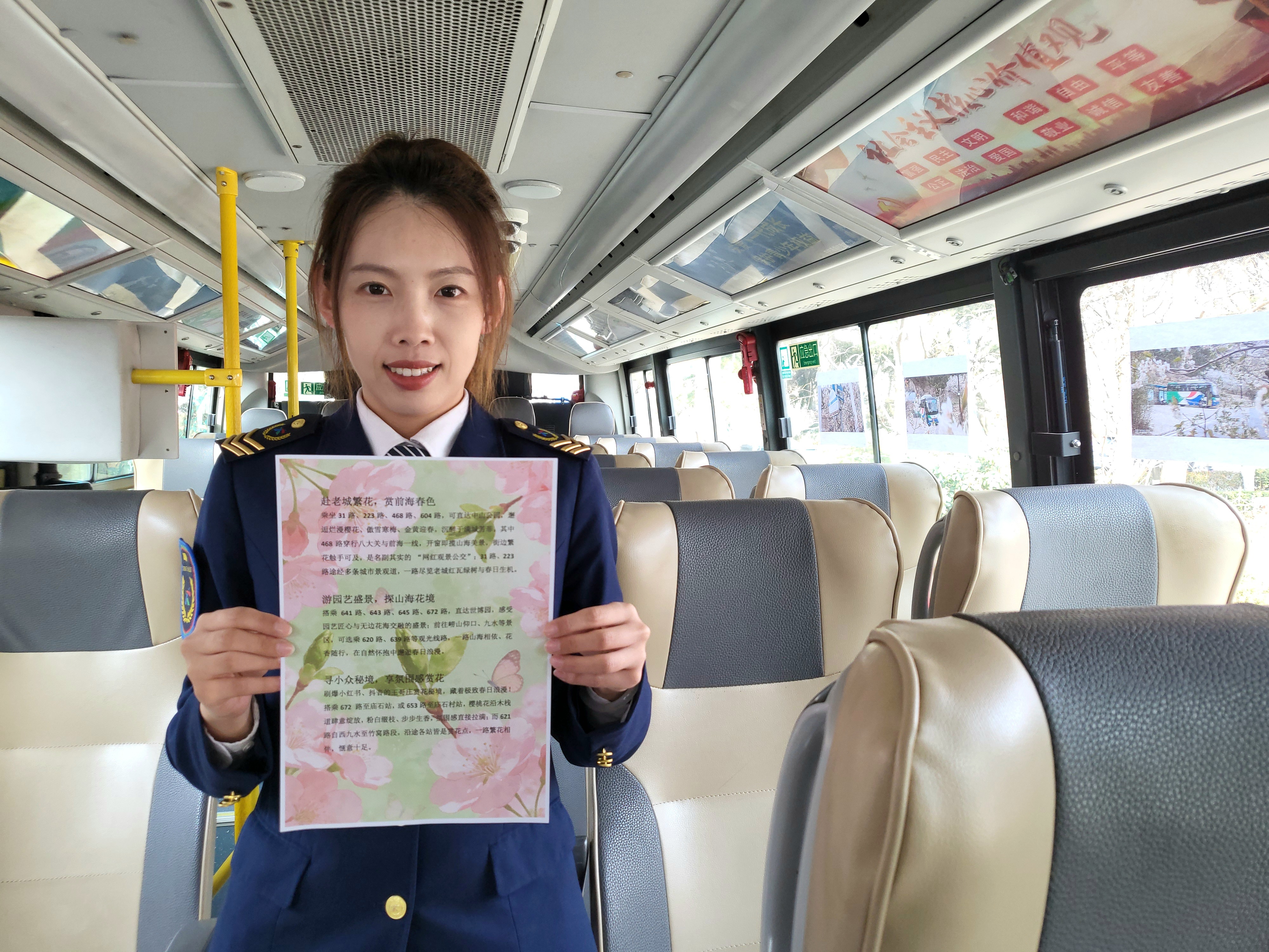 为提升出游体验,青岛温馨巴士645路匠心打造春日主题车厢,以清新花艺、赏花海报、节气科普装点空间,让通勤、出游全程春意盎然。同时,公司根据客流变化动态适时加密班次,全力保障高峰时段出行顺畅,让每一趟赏花之旅都安心、舒心、顺心。