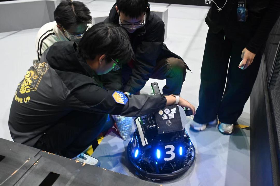 在备场区,山东科技大学SmartRobot战队的姜博仁正在调试步兵机器人。“我们用的是轮腿结构,站起来就可以跨越台阶,里面的算法是我们的核心优势。”他指着腿部关节说。齐鲁工业大学Adam战队队长虢庆翔是大二学生,因高中参加过相关赛事,大一就被“特招”进战队。“今年我们所有的车辆全是新车,大概造了10辆。战队曾经历‘断代’,我们这一届就想拼一拼,为学弟学妹们留下点好东西。”