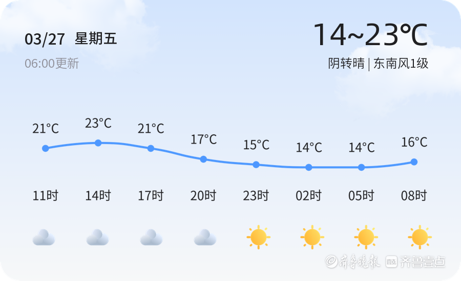 今天是3月27日,星期五,农历二月初九。济南市今日天气阴转晴,气温适中,最高气温23℃,最低气温14℃,当前温度14.6℃。东南风1级,空气湿度54%,PM2.5指数为104,属于轻度污染。建议市民外出时随身携带雨具,注意防晒,并关注空气质量变化。未来三天济南市天气以多云转晴为主,气温在13℃至24℃之间波动,风力较小。建议市民根据天气变化适时增减衣物,注意防晒和防风。济南市气象部门提醒市民,近期天气变化较大,温差明显,市民需注意保暖,预防感冒,同时保持良好的作息,确保身体健康。未来七天济南市天气以多云为主,气温总体适宜,市民可合理安排出行计划,享受春日美好时光。