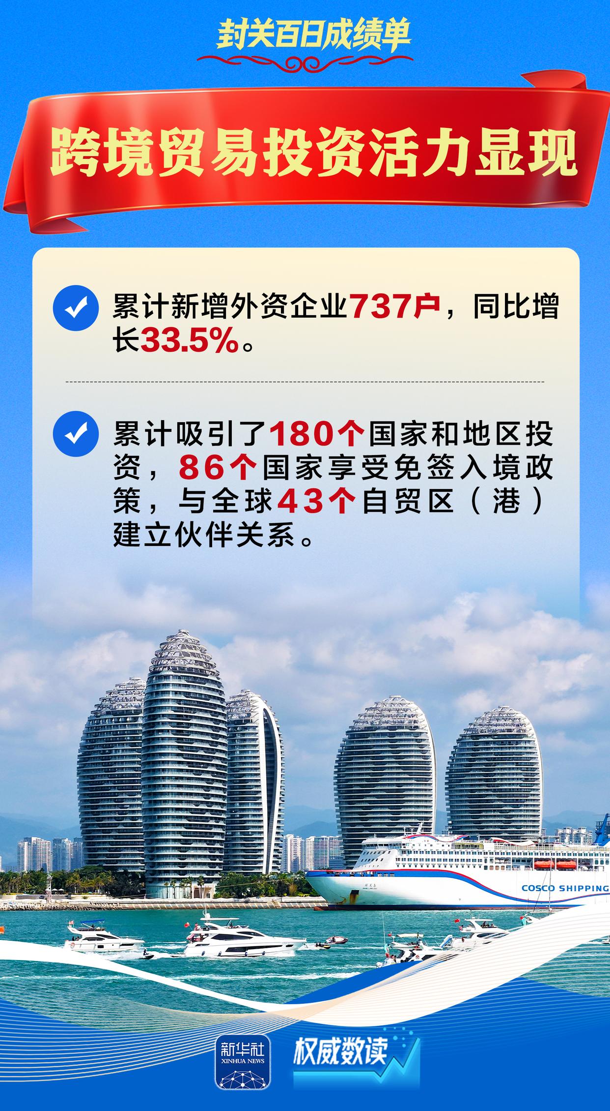 3月27日,海南自贸港迎来全岛封关运作100天。封关以来,自贸港以制度集成创新为核心,以高水平开放为牵引,稳扎稳打、有序推进,政策落地见效、活力持续释放,自贸港建设呈现出蹄疾步稳、欣欣向荣的良好态势。我们梳理了9组数据,跟随海报,读懂海南自贸港封关百日“成绩单”。(新华社)