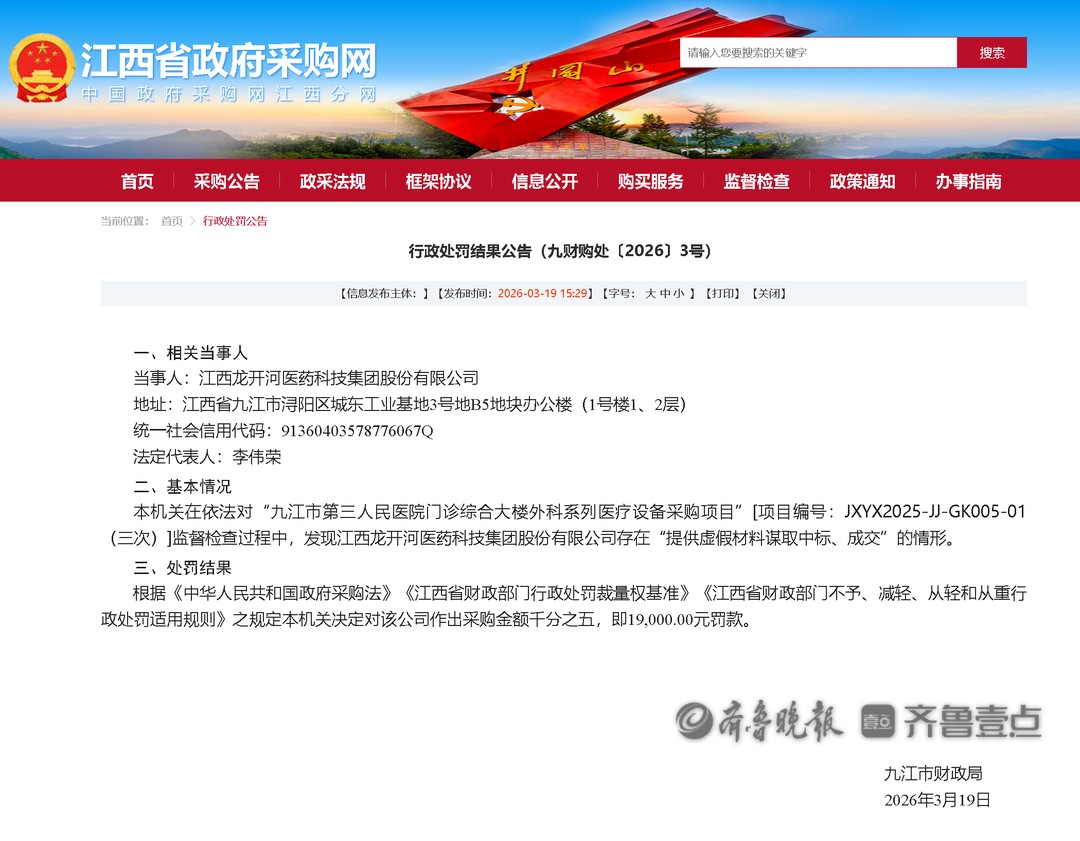 3月19日,齐鲁晚报·齐鲁壹点记者从江西省政府采购网行政处罚公告一栏获悉,江西龙开河医药科技集团股份有限公司(下称“龙开河集团”)在“九江市第三人民医院门诊综合大楼外科系列医疗设备采购项目”[项目编号:JXYX2025-JJ-GK005-01(三次)]中,存在“提供虚假材料谋取中标、成交”的情形,被九江市财政局罚款1.9万元。