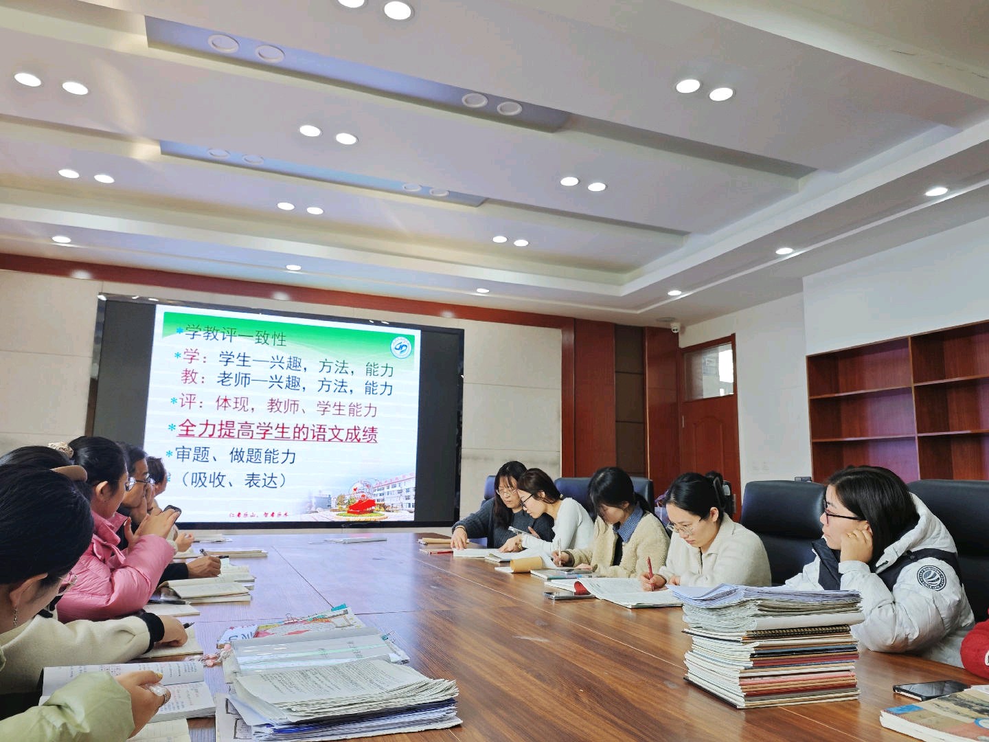 海岱学校集体备课室内,一场聚焦中考的备考研讨会正进行。来自庙子初级中学、黄楼初级中学、东城学校等联盟校的英语学科教研组长及骨干教师齐聚一堂,围绕中考英语命题趋势、高频考点梳理、易错题型打磨等关键环节展开深入研讨。最终将形成备考专辑,并上传至智慧教育云平台,实现区域内资源共享、智慧互通。