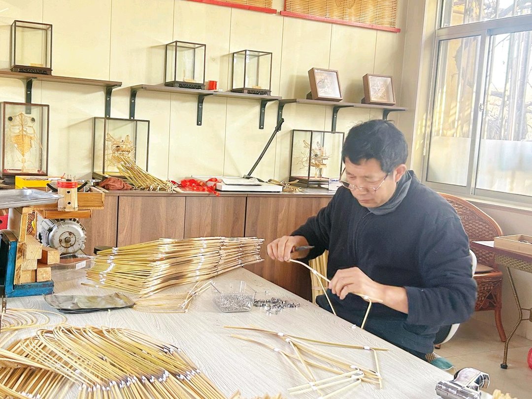 在吉风竹艺风筝工艺品厂,非遗手艺人王旭升正在制作竹艺风筝,旁边产品展柜里,整齐地摆放着龙头、螳螂、金蝉等竹艺风筝摆件,这些产品工艺精湛,连昆虫腿上的倒刺都清晰可见。“这些摆件用榫卯技艺插接,不用任何金属件,很受消费者欢迎。”王旭升介绍,他的作品需经选竹、破篾、扎架等十余道工序,对工艺精度要求极高。