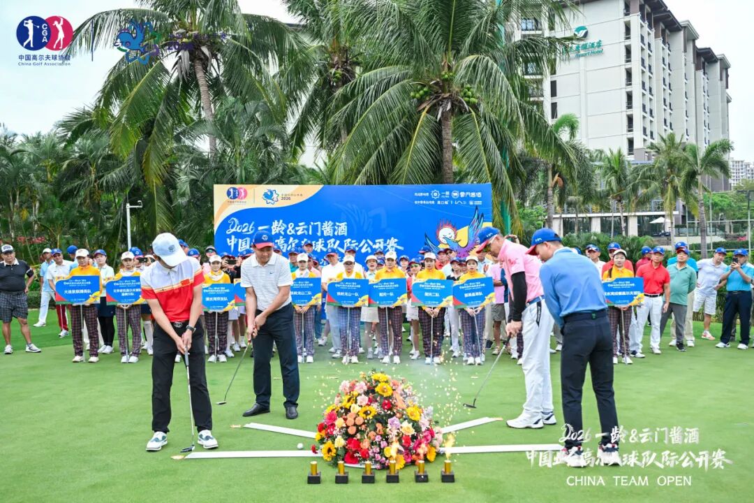 云门酒业海南运营中心总经理董传亮为赛事致辞,并与北京奥邦华创体育发展有限公司董事长、赛事执行主任孙立平,一龄医院管理集团会务处处长、一龄高尔夫球精英医养俱乐部副秘书长兼活动策划与组织委员会主任袁丞丰,海南清水湾高尔夫球会总经理何冠军共同为比赛开出彩球,拉开本站赛事帷幕。