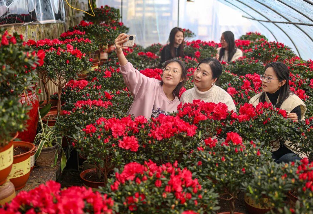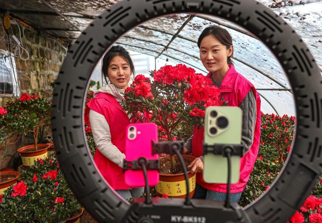 在西车脚河村的花卉大棚里,各色杜鹃、山茶花竞相绽放、花团锦簇,香气扑鼻。浓郁的芳香沁人心脾。在花卉大棚内,时常能看到这样的场景:绚烂的花丛旁,一部手机、一个支架,对着镜头的“新农人”正热情地向全国网友介绍着家乡的杜鹃与茶花。