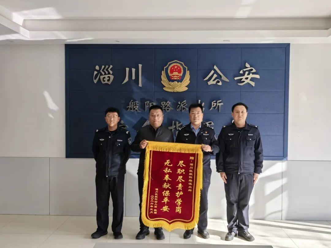 近日,淄川区般阳幼儿园工作人员专程来到般阳路派出所,将一面印有“尽职尽责护学岗 无私奉献保平安”的锦旗送到民警手中,对派出所长期坚守护学岗位、全力守护校园师生安全表示感谢。