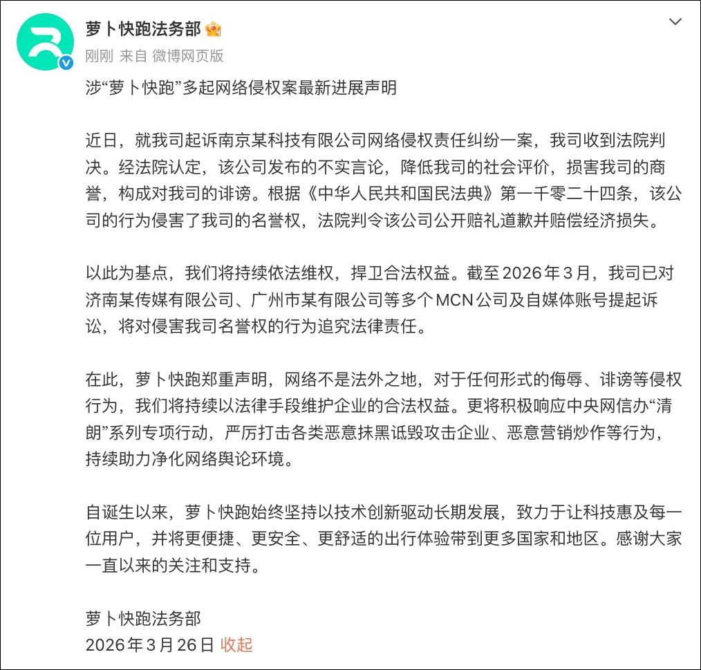 此次诉讼并非孤例。据萝卜快跑方面透露,截至2026年3月,公司已对多个MCN机构及自媒体账号提起诉讼,集中打击一批涉嫌恶意造谣、抹黑企业的网络账号。