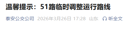3月26日,泰安市公交公司发布温馨提示:51路公交临时调整运行路线。详情如下: