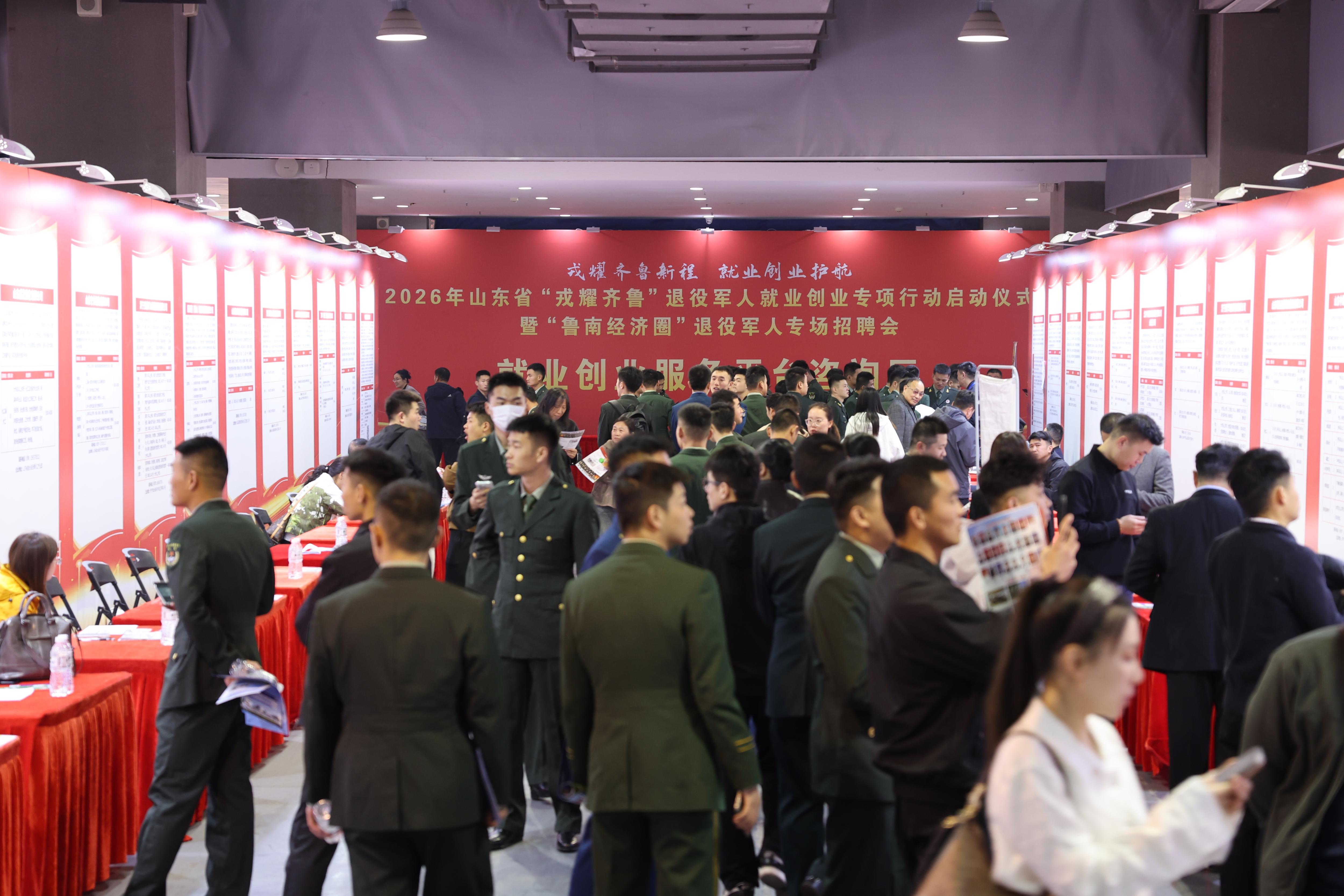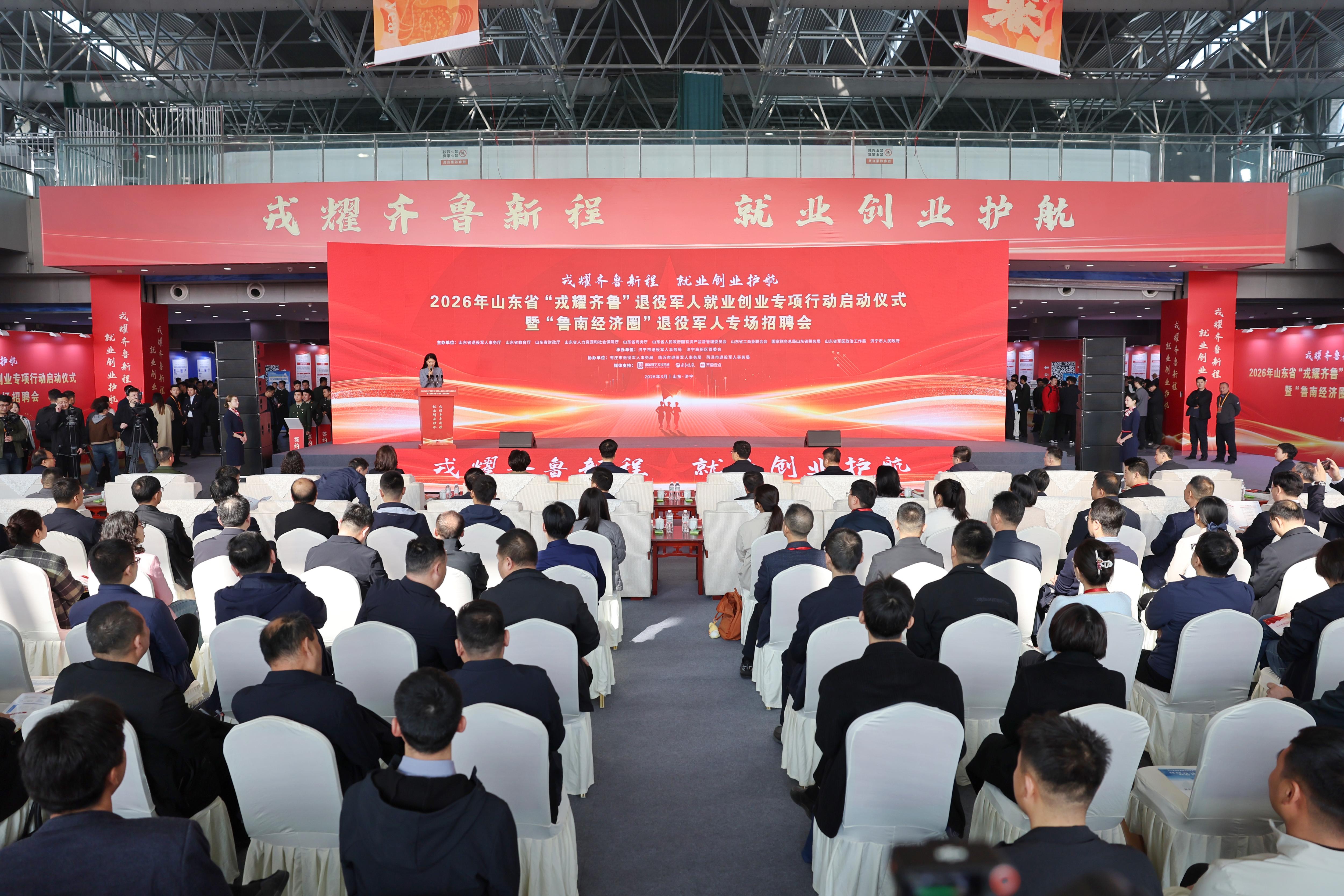 3月27日,2026年山东省“戎耀齐鲁”退役军人就业创业专项行动启动仪式暨“鲁南经济圈”退役军人专场招聘会在济宁市举办。