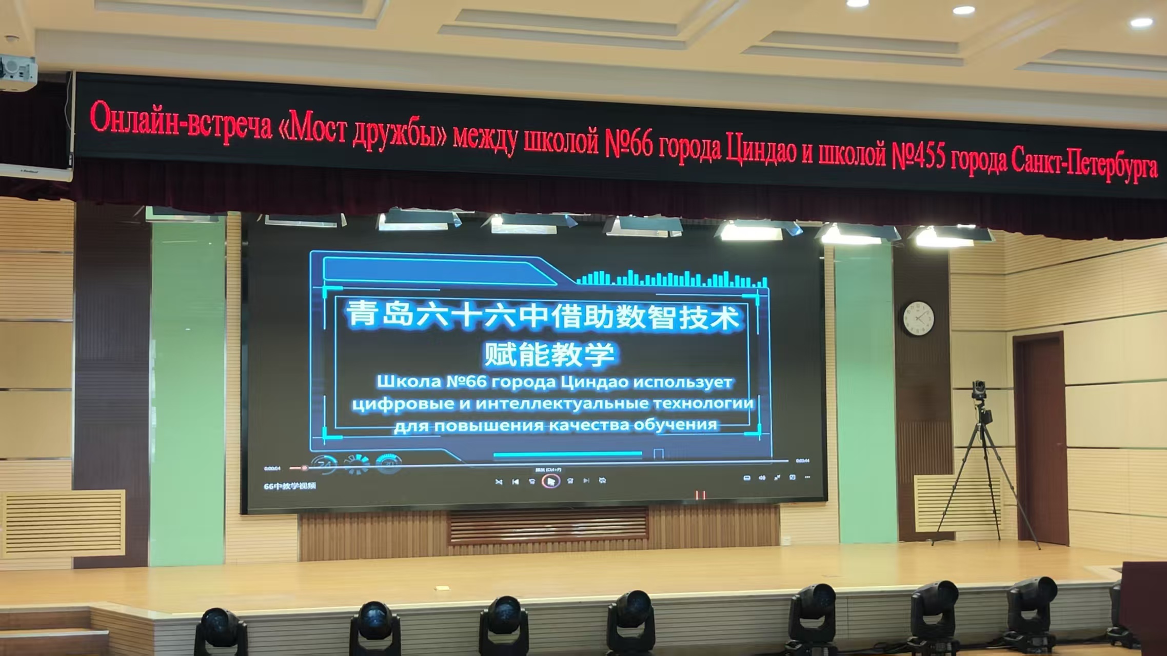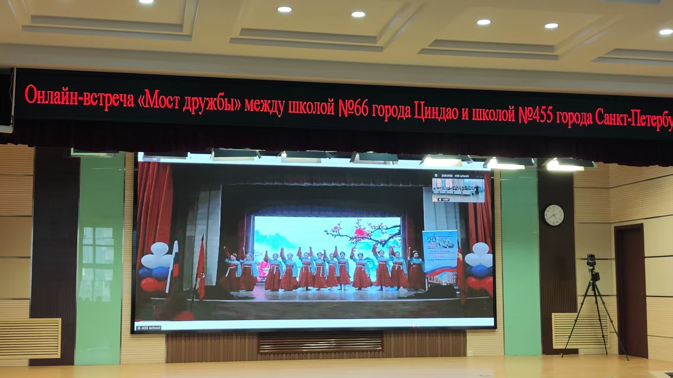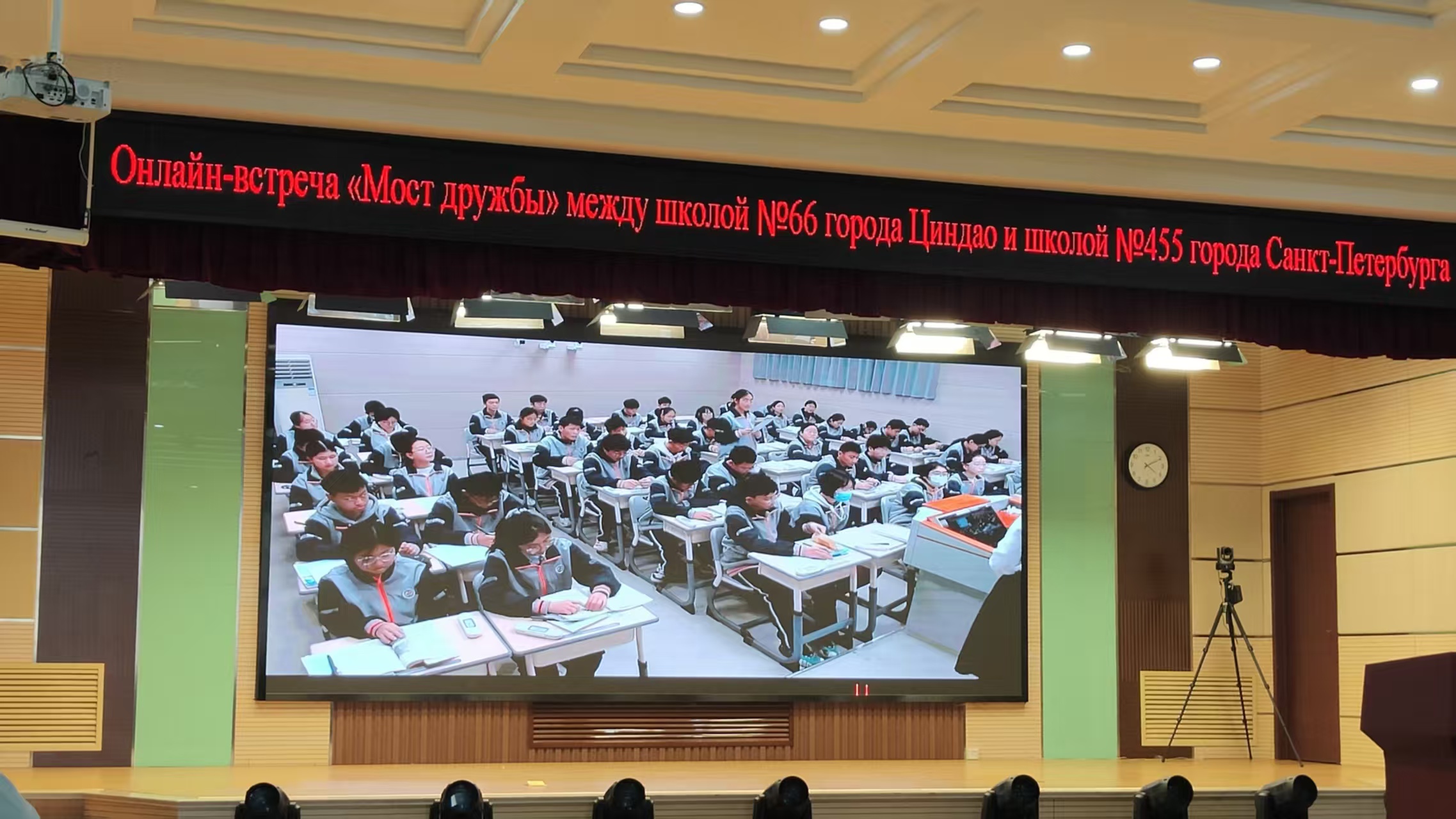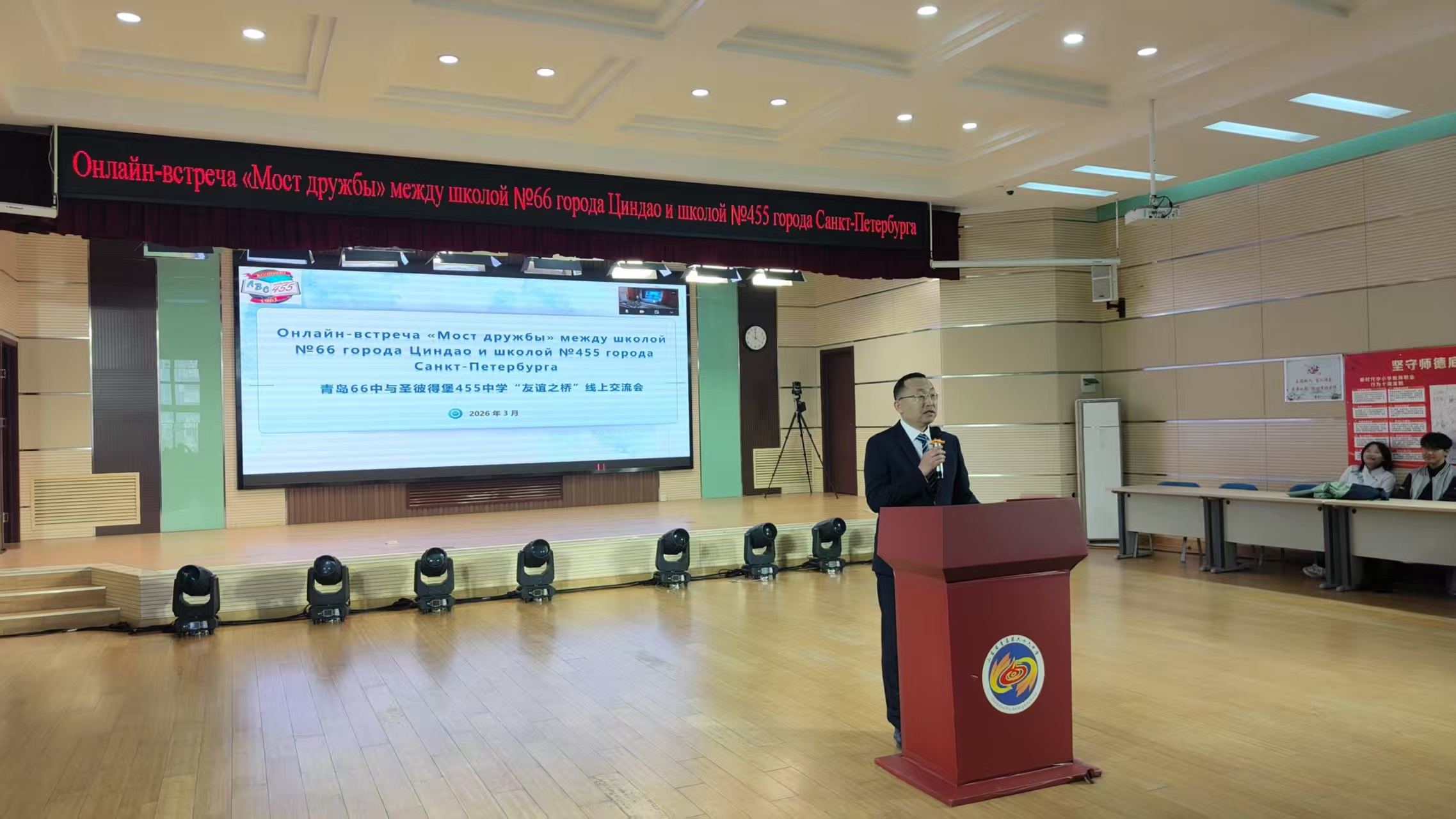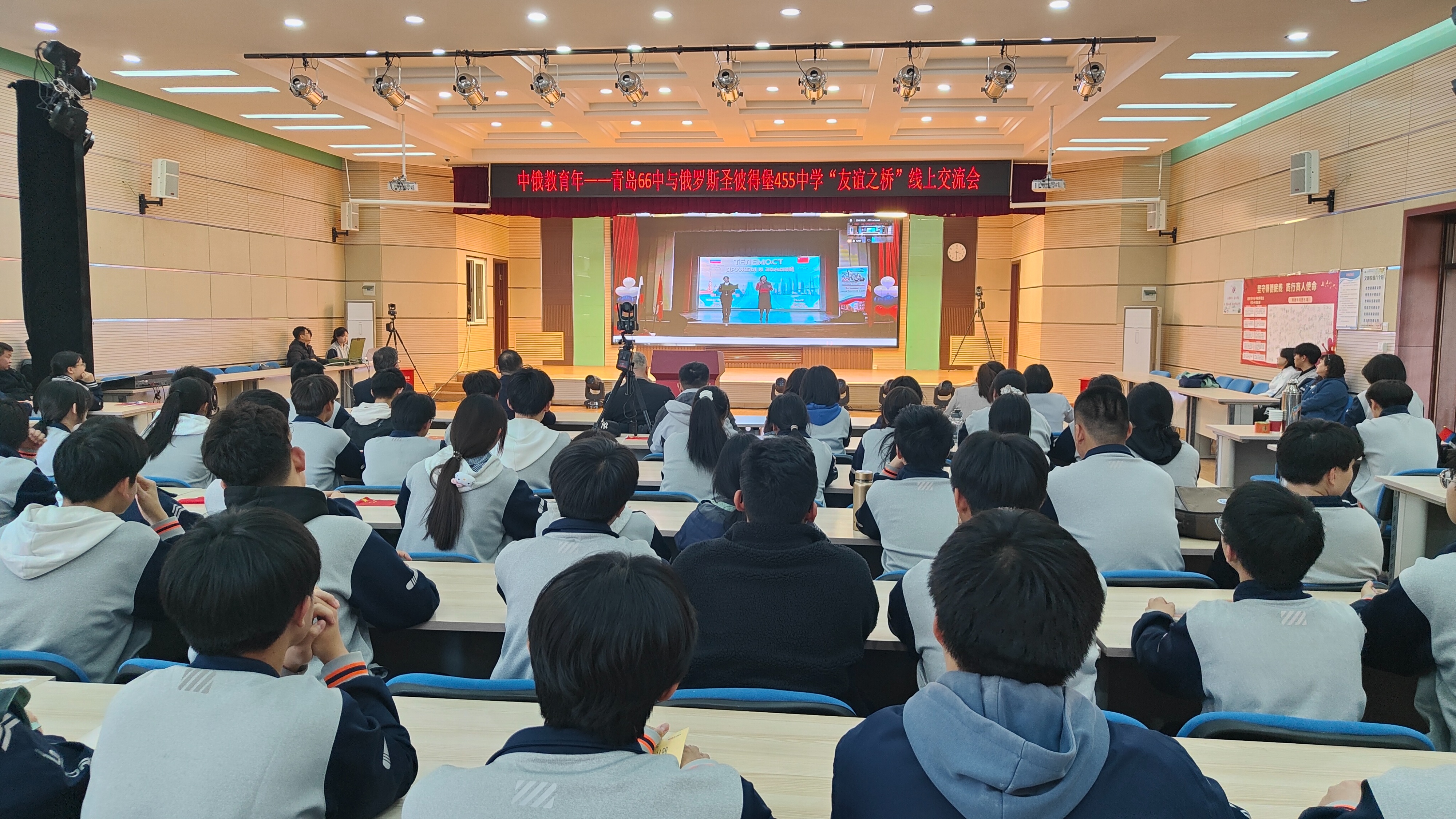 3月25日下午,青岛六十六中与俄罗斯圣彼得堡455中学“友谊桥”线上交流会如期举行,两国师生云端相聚,以语言为媒、以文化为桥,共叙友谊、共话发展。本次活动既是青岛与圣彼得堡友好城市深厚情谊的生动延续,更是青岛六十六中践行国际化教育理念、深化中俄教育交流的具体实践,彰显了学校在对外交流合作、教育高质量发展中的责任与担当,也为中俄教育年增添了鲜活实践成果。本次线上交流会以“友谊”为核心,采用俄中双语主持模式,线下主会场设于青岛六十六中学术报告厅,线上通过腾讯会议实现双向联动。青岛市教育局国际交流合作处二级调研员肖建兴,青岛六十六中党委副书记、副校长王光鹏等领导,俄语组全体教师及高一、高二年级全体俄语学生在中方会场参与活动;圣彼得堡国际交流协会主席玛格丽塔·穆德拉克,圣彼得堡455中学校长柳博芙·吉米娜及该校师生代表在线上同步参与,共赴这场跨越国界的教育文化之约。